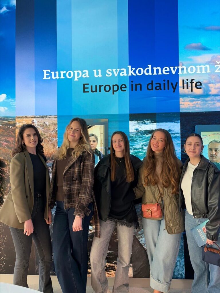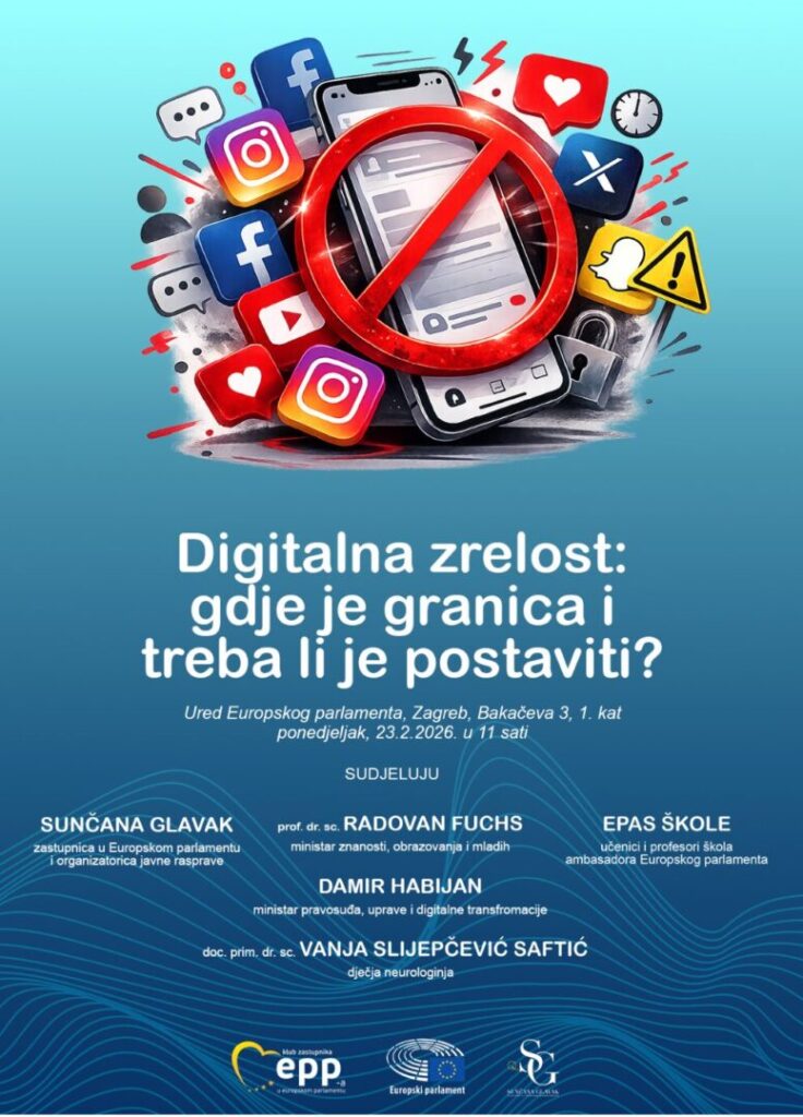 U ponedjeljak, 23.veljače 2026., EU ambasadorice naše škole – Marta Brkljača, Melani Gršetić, Marta Josić, Jana Lukenda i Antea Meštrović su u pratnji pedagoginje Oliete Horvat Kardoš i ravnateljice Brankice Žugaj, sudjelovale u značajnoj javnoj raspravi o digitalnoj sigurnosti i digitalnoj zrelosti mladih koja je održana u Zagrebu u Kući Europe u organizaciji hrvatske zastupnice u EU parlamentu Sunčane Glavak. Rasprava pod nazivom „Digitalna zrelost: gdje je granica i treba li je postaviti?“ okupila je učenike iz više škola uključenih u EPAS program te visoke državne dužnosnike. Među sudionicima su bili ministar znanosti, obrazovanja i mladih Radovan Fuchs, ministar pravosuđa, uprave i digitalne transformacije Damir Habijan te dječja neurologinja Vanja Slijepšević Saftić. U središtu rasprave bilo je pitanje mogućeg uvođenja dobnih ograničenja za korištenje društvenih mreža s naglaskom na zaštitu mentalnog zdravlja i prevenciju negativnih pojava u digitalnom okruženju.