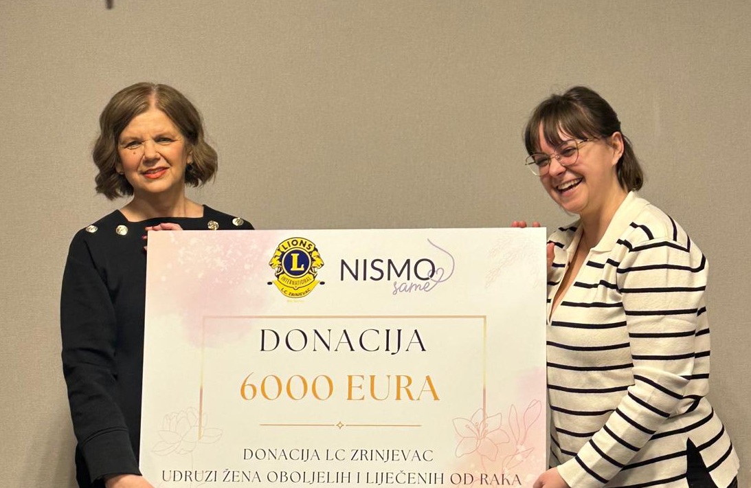 Uspješno je završena plemenita humanitarna akcija Lions kluba Zrinjevac kojom su prikupljena značajna sredstva za podršku ženama koje se bore s teškom bolešću. Akcija je kulminirala svečanim uručenjem donacije u iznosu od 6.000,00 eura udruzi „Nismo same“ za njihov hvalevrijedan projekt „Nisi sama – ideš s nama“.