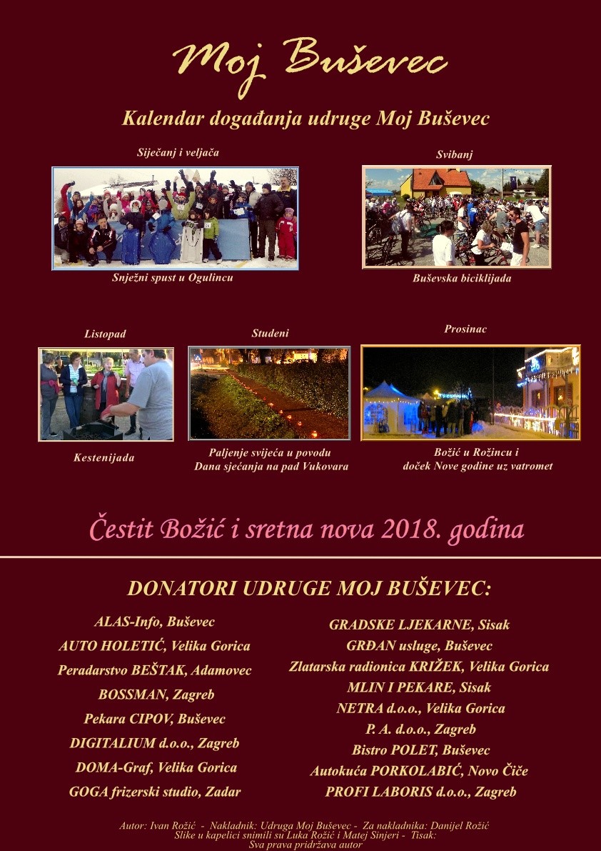 Autor Kolendara je Ivan Rožić, a fotografije su snimili Luka Rožić i Matej Sinjeri. Zahvaljujemo udruzi Moj Buševec na dopuštenju da Kolendar objavimo.