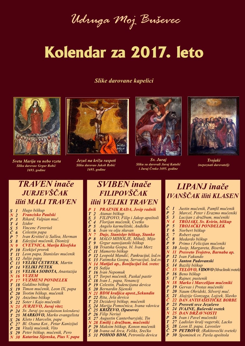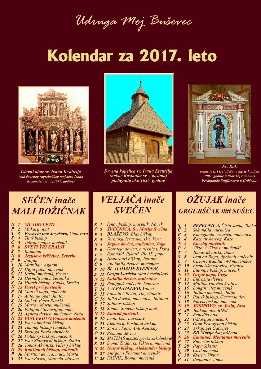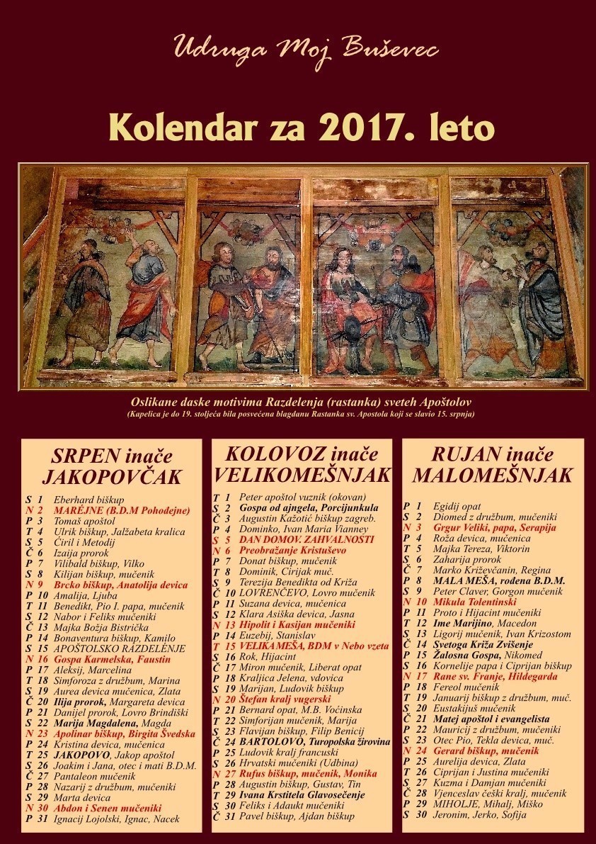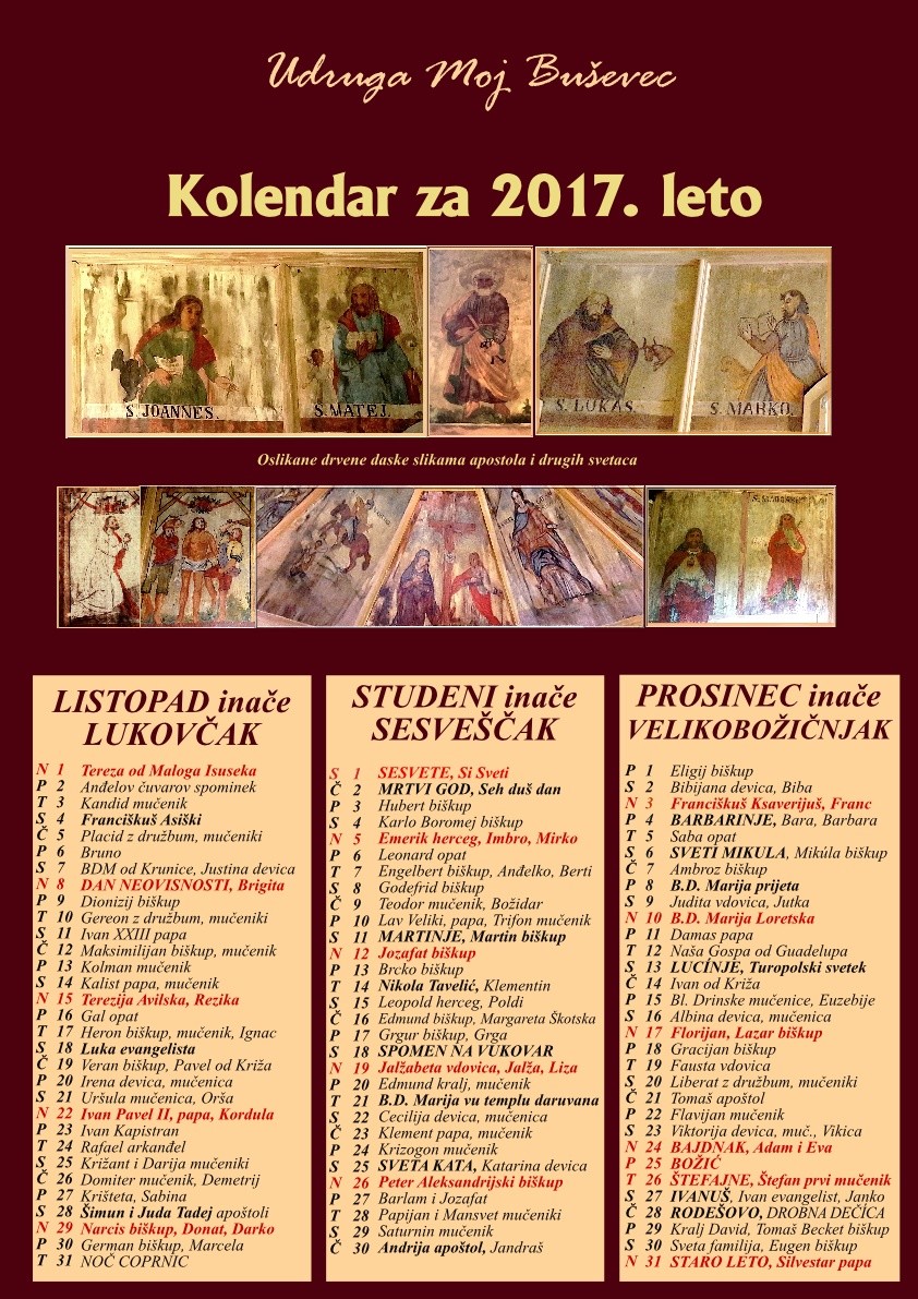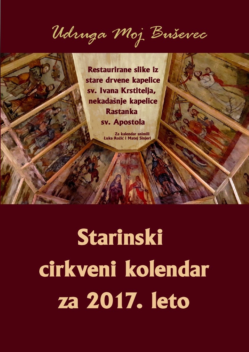 Udruga “Moj Buševec” treću godinu zaredom objavila je Starinski cirkveni kolendar. U ovogodišnjem se izdanju na A3 formatu mogu vidjeti restaurirane slike iz drvene kapelice sv. Ivana Krstitelja, nekadašnje kapelice Rastanka sv. Apostola u Buševcu.