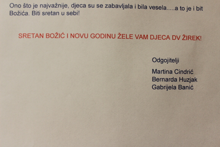 “Dijete svoje aktivnosti povezuje uz vrijeme. Što su zbivanja konkretnija i djetetova aktivnost u njima to će ono lakše spoznati i pamtiti proticanje vremena. (…) Naše stvaralačko biće pridaje blagdanskim trenutcima i nešto osobno i jedinstveno, ono čime je svaki Božić poseban i neponovljiv”, stoji u blagdanskoj poruci djece i odgojitelja Dječjega vrtića Žirek.