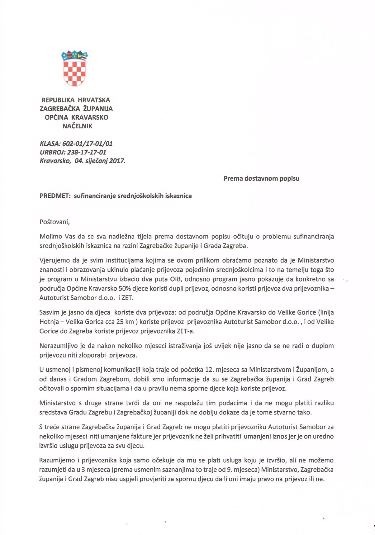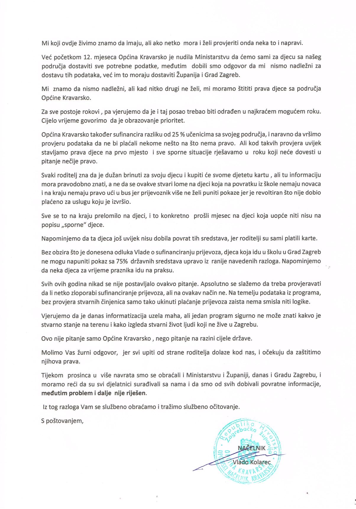 – Sasvim je jasno da djeca koriste dva prijevoza. Od područja Općine Kravarsko do Velike Gorice, linija Hotnja — Velika Gorica, koriste prijevoz prijevoznika Autoturist Samobor da nakon nekoliko mjeseci istraživanja još uvijek nije jasno da se ne radi o duplom prijevozu niti zloporabi prijevoza. U usmenoj i pismenoj komunikaciji koja traje od početka 12. mjeseca s Ministarstvom i Županijom, a od danas i Gradom Zagrebom, dobili smo informacije da su se Zagrebačka županija i Grad Zagreb očitovali o spornim situacijama i da u pravilu nema sporne djece koja koriste prijevoz – stoji u dopisu načelnika Općine Kravarsko Vlade Kolarca od 4. siječnja MZOS-u.
