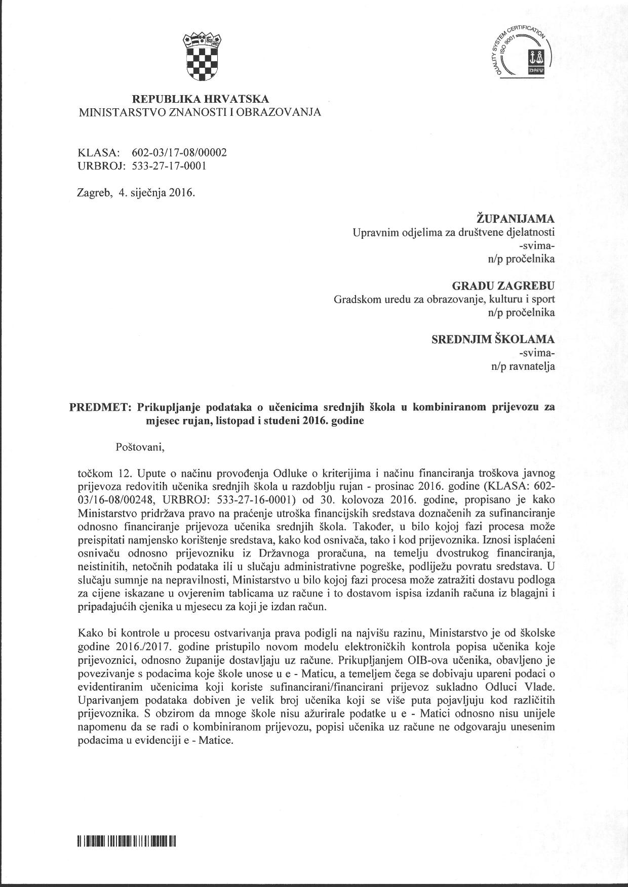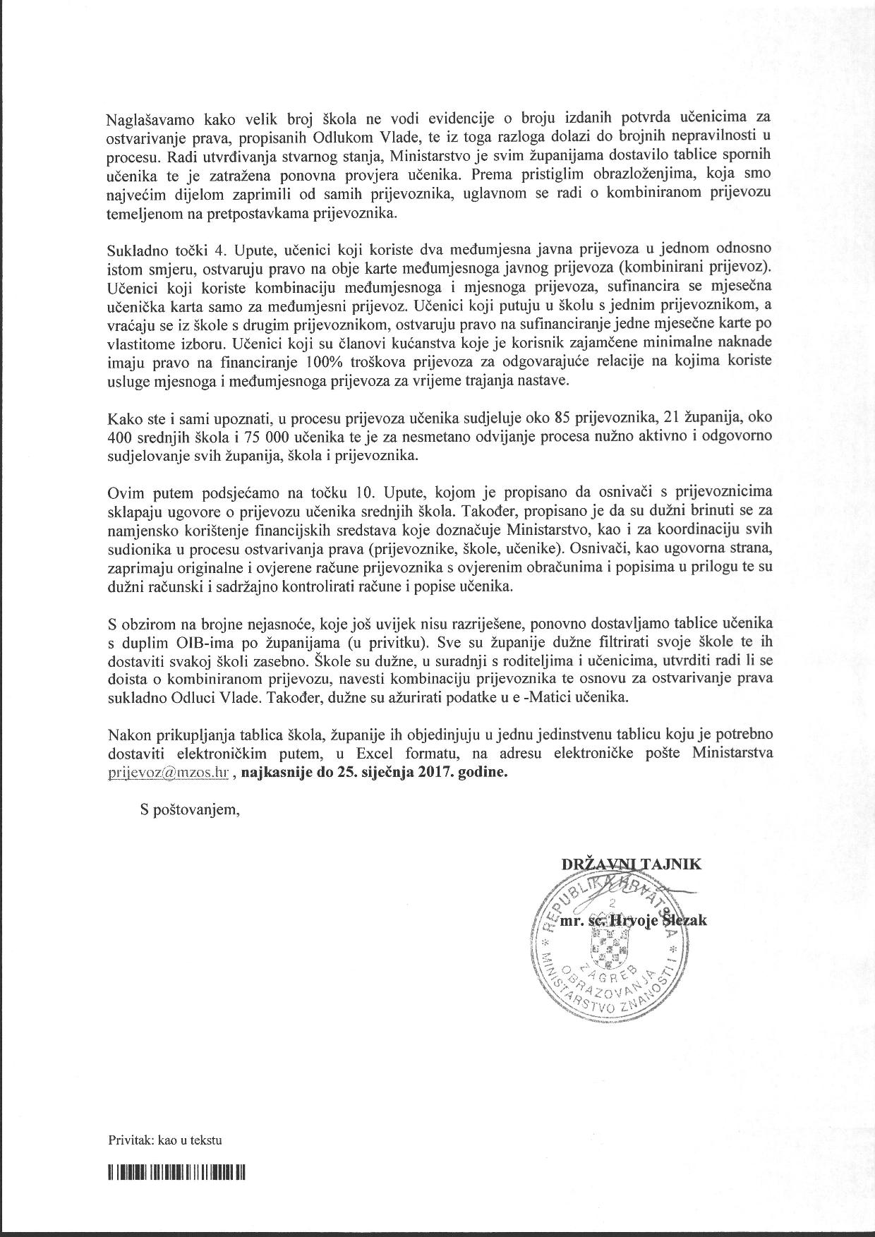 Svoje razloge objasnilo je dopisom od 4. siječnja ove godine. – Uparivanjem podataka dobiven je velik broj učenika koji se više puta pojavljuju kod različitih prijevoznika. S obzirom na to da mnoge škole nisu ažurirale podatke u e – Matici odnosno nisu unijele napomenu da se radi o kombiniranom prijevozu, popisi učenika uz račune ne odgovaraju unesenim podacima u evidenciji e – Matice – poručili su iz Ministarstva.