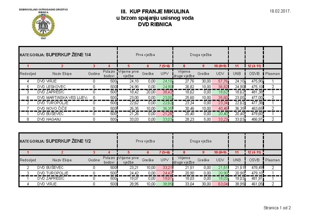 Završen je III. Kup Franje Mikulina, vatrogasno natjecanje u brzom spajanju usisnog voda. Natjecanje je organizirala DVD Ribnica, održalo se u dvorani Osnovne škole Novo Čiče, a okupilo je 55 vatrogasnih ekipa iz deset hrvatskih županija.