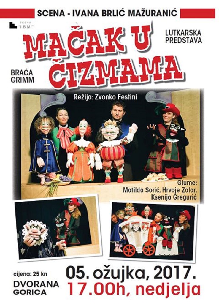 Sutra u 17 sati na goričkoj sceni gostuje predstava Lutkarske scene “Ivana Brlić Mažuranić” – Mačak u čizmama. Autori ove predstave su Braća Grimm, a redatelj Zvonko Festini. Uloge tumače Matilda Sorić, Hrvoje Zalar i Ksenija Gregurić.