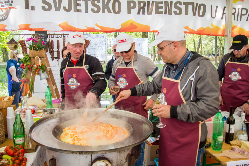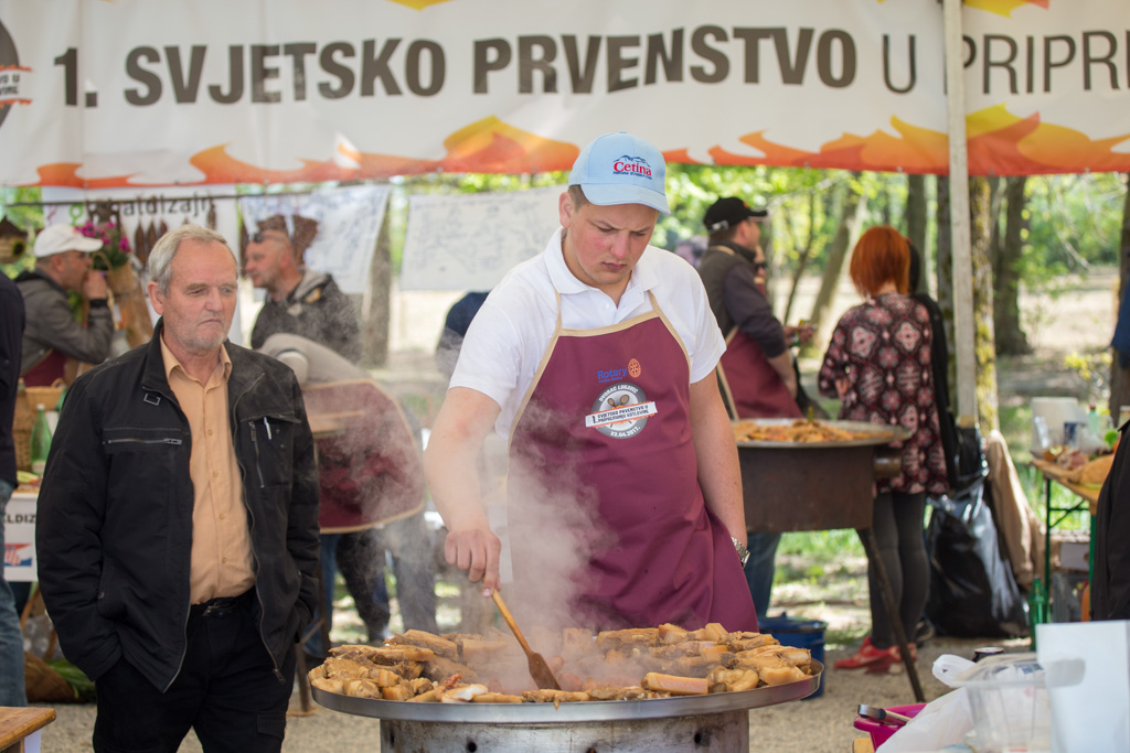 Natjecatelji su kotlovinu pripremali na razne načine. – Pristupi kotlovini koje smo vidjeli ovdje su zaista raznoliki tako da imamo kozletinu, crnu turopoljsku svinju, imamo jedan samoborski pristup sa svinjskim nogicama. Zaista jedno gastronomsko bogatstvo danas ovdje pred nama – dodao je Šembera.Jedan od natjecatelja bio je Tomo Pavlečić koji se natjecao za Rotary klub. On i supruga su bivši ugostitelji i bivši vlasnici mesnice iz Dubranca koji imaju 45 godina iskustva pripremanja kotlovine. Otkrio nam je nekoliko tajni kako napraviti dobru kotlovinu. – Nije nekakva tajna napraviti dobru kotlovinu. Za dobru turopoljsku kotlovinu prvo mora biti dobro meso, drugo mora biti obavezno domaća mast, domaće povrće jer zna se domaće je domaće. Ne treba tu filozofirati i stavljati posebne začine – objasnio je Pavlečić te dodao kako će meso biti mekano kada se ne prepeče već kuha.Žiri su činili Rene Bakalović te članovi Rotary kluba. Jedan od članova žirija je i Zoran Šimunić iz Gastronomada koji se natjecao van kategorije jer je njegova ekipa dobila slobodu raditi malo drugačiju kotlovinu. – Prvo smo od susjeda ukrali svinju. Dobili smo od njih špek i malo čvaraka. Jutros smo u šumi nabrali vrganja. Skočili smo po dvije, tri pečurke, a kolega je donio sušenih. Mi smo prebacili to više na jedan gljivni element. Kolega Aleks koji se bavi uzgojem koza tu do nas je napravio kotlovinu s kozom tako da smo si mi dali jednu slobodu. Koristili smo i začine koji se ne koriste – stavili smo garam masalu, malo kleka i klekovih bobicamalo curryja, dimljene paprike – ispričao je Šimunić.On nam je ispričao i kako su došli na ideju organiziranja baš svjetskog prvenstva. – Nitko se nikad nije sjetio to tako napraviti. Dečki iz Rotarryja, kad smo davno pričali, rekli su zašto ne bi napravili svjetsko prvenstvo. Došli su ljudi koji nisu iz Hrvatske koji su skužili da je to naš način pripreme da se u isto vrijeme mora peći, dinstati pa onda moraš pirjati. Uglavnom, njima se to jako svidjelo i rekli smo okej, neka bude prvo svjetsko prvenstvo i sljedeće godine očekujemo još više ljudi – objasnio je Šimunić.Sa svojim prijateljima kotlovinu je pripremala i ekipa Dražen i prijatelji. – Prije svega sudjelujemo u humanitarnoj akciji koja je usmjerena za naš Centar za odgoj i obrazovanje za djecu s teškoćama u razvoju. Uvijek se uključujemo pa smo se i sad na poziv Rotaryja iz Velike Gorice. Imam puno prijatelja, međutim, kada se pije, kuha, veseli i kada se radi imam još više prijatelja tako da su se i danas ovdje mnogi moji prijatelji odazvali. Nadam se da ćemo dostojno prezentirati našu turopoljsku kotlovinu kao naše tradicionalno jelo – poručio je gradonačelnik Velike Gorice Dražen Barišić.– Rekli bi za kotlovinu spremni. Naravno da smo se priključili ovoj humanitarnoj akciji i nadamo se da će biti puno kupaca ovoga što ćemo zajedno pripremiti i siguran sam da ćemo zadovoljiti kriterije Velikogoričana i svih gostiju, da ćemo nešto dobro napraviti – rekao je Vladimir Bregović, HDZ-ov kandidat za župana Zagrebačke županije.Specifična za turopoljsku kotlovinu je turopoljska svinja. To je jedan od sastojaka recepta koji se, na ovom području, prenosi s koljena na koljeno. – Što se tiče turopoljske svinje ona je bila ovdje zaista udomaćena ovdje u Turopolju i nosi naziv. Ona je danas jedna od dvije hrvatske autohtone pasmine svinja. Njezin problem je nastao sredinom prošlog stoljeća dolaskom bijele industrijske svinje. Ona je s veći udjelom mesa prevladala a Turopoljac ipak ima veći udio masti. Nije bilo više tolike potrebe za tim, a i dogodila se i ta zabrana ispaše odnosno držanja svinje na otvorenom. Mi smo danas kao Plemenita Opčina Turopoljska udruga volontera, ali brinemo se za pajceke. Imamo nekih stotinjak svinja ovdje u Lukavcu u šumi na otvorenom. Možemo u šali reći da je POT svjetski uzgajivač i proizvođač turopoljske svinje. To je s jedne strane lijepo čuti, a s druge premali je broj uzgajivača, ali i samih svinja – ispričao je Juraj Odrčić, župan POT-a.Turopoljska svinja specifična je po životu na otvorenom, ali po tome što je masnija. – Nakon Drugog svjetskog rata navike potrošača su se mijenjale i to je dovelo s jedne strane do situacije da je turopoljska svinja izgubila svoj značaj. S druge strane, danas se trendovi mijenjaju, nešto što je bilo prije desetak godina totalno nezdravo postalo je IN. To vrlo dobro koriste ove lokalne male pasmine koje se drže na specifičan način – ispričao je Željko Mahnet iz Poljoprivredne agencije.