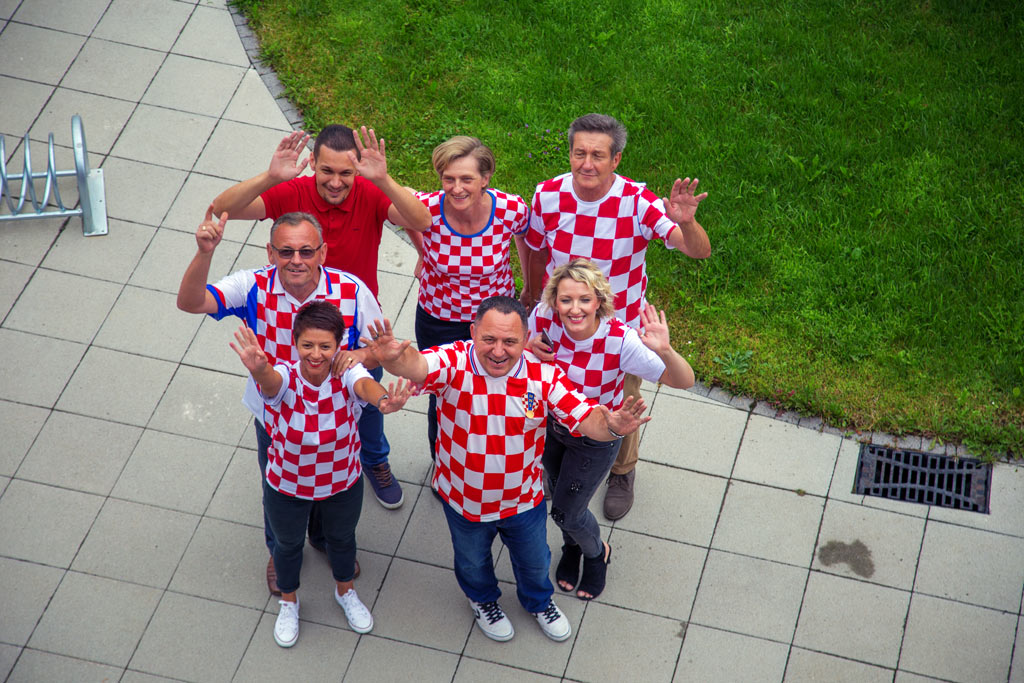 Točno u podne sišli su svi pred zgradu pa se uz navijanje postavili pred fotoaparate. Nije svaki dan utakmica Hrvatske za finale Svjetskog prvenstva, treba to i zabilježiti; glasno i u boji, a kako drugačije. Navijali su u sav glas, pjevala se tu i “Moja domovina”, radosne i pozitivne atmosfere nije nedostajalo.