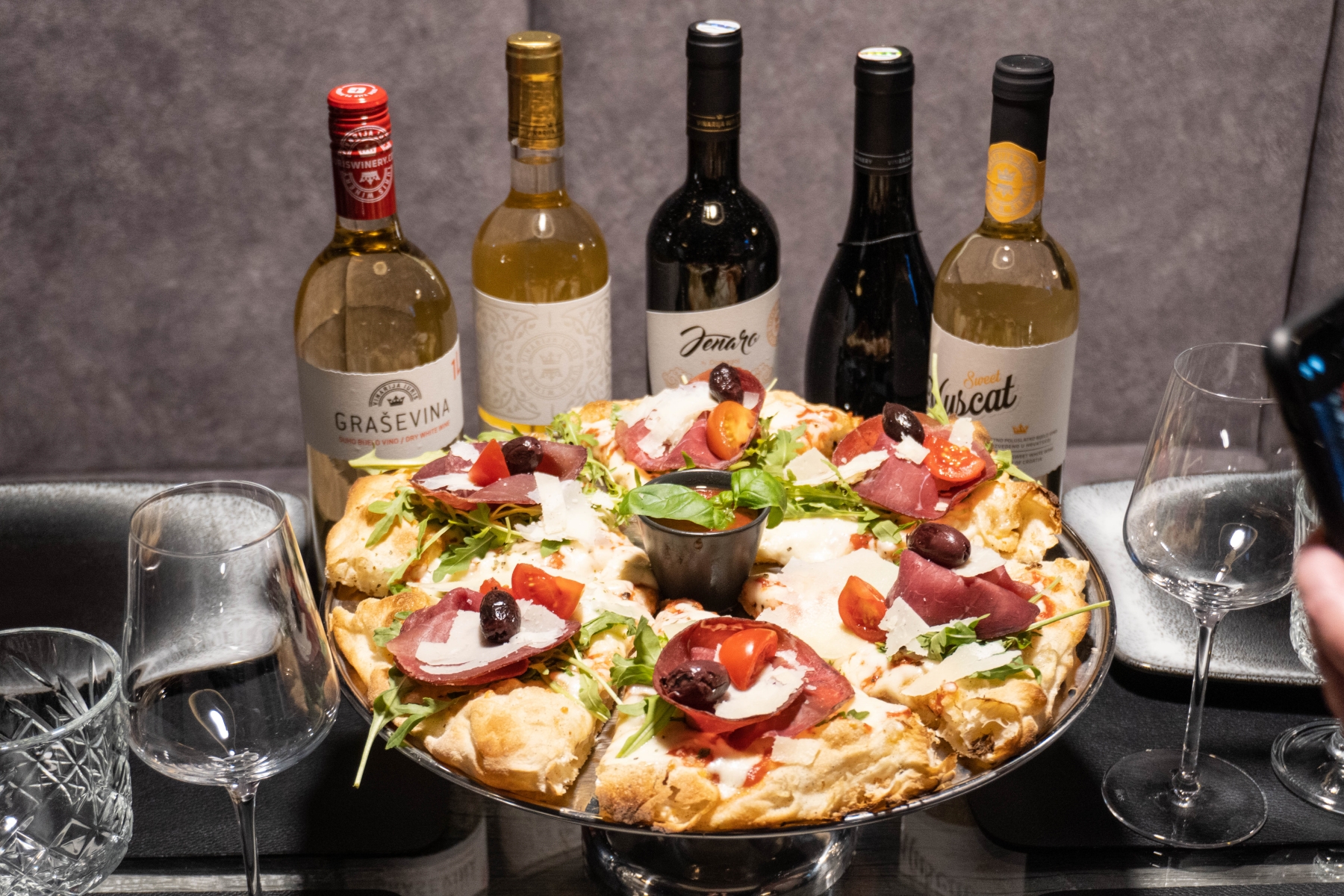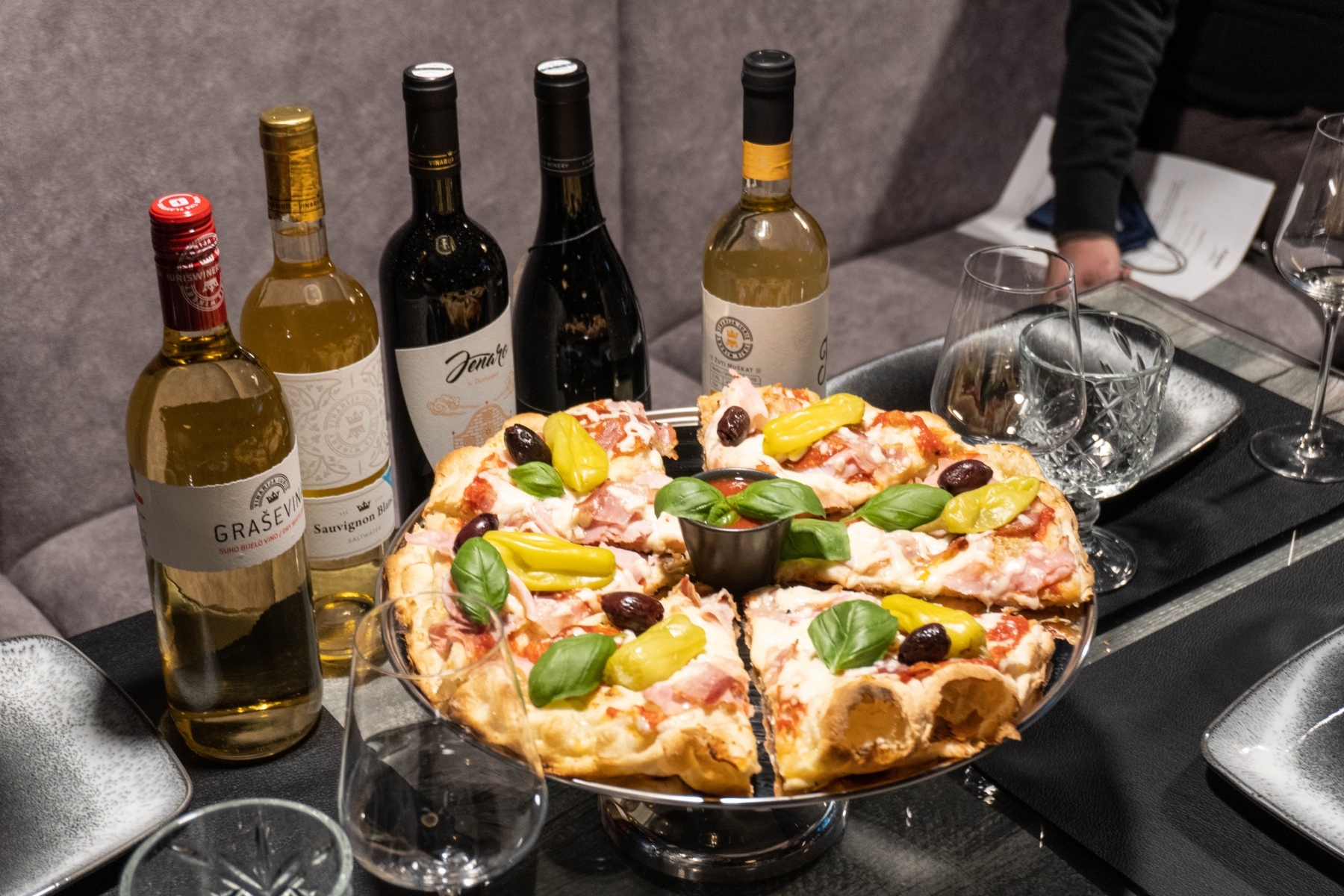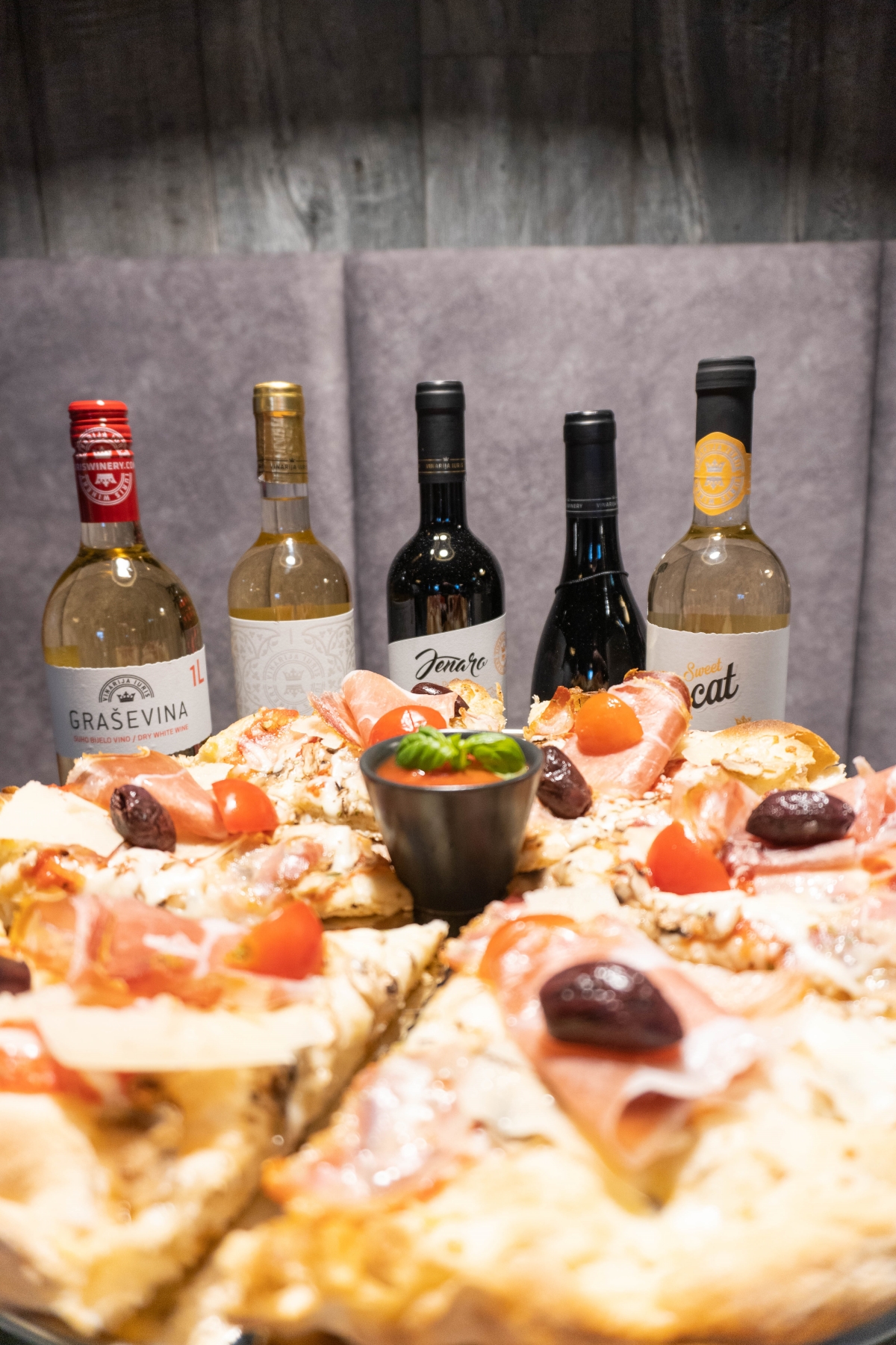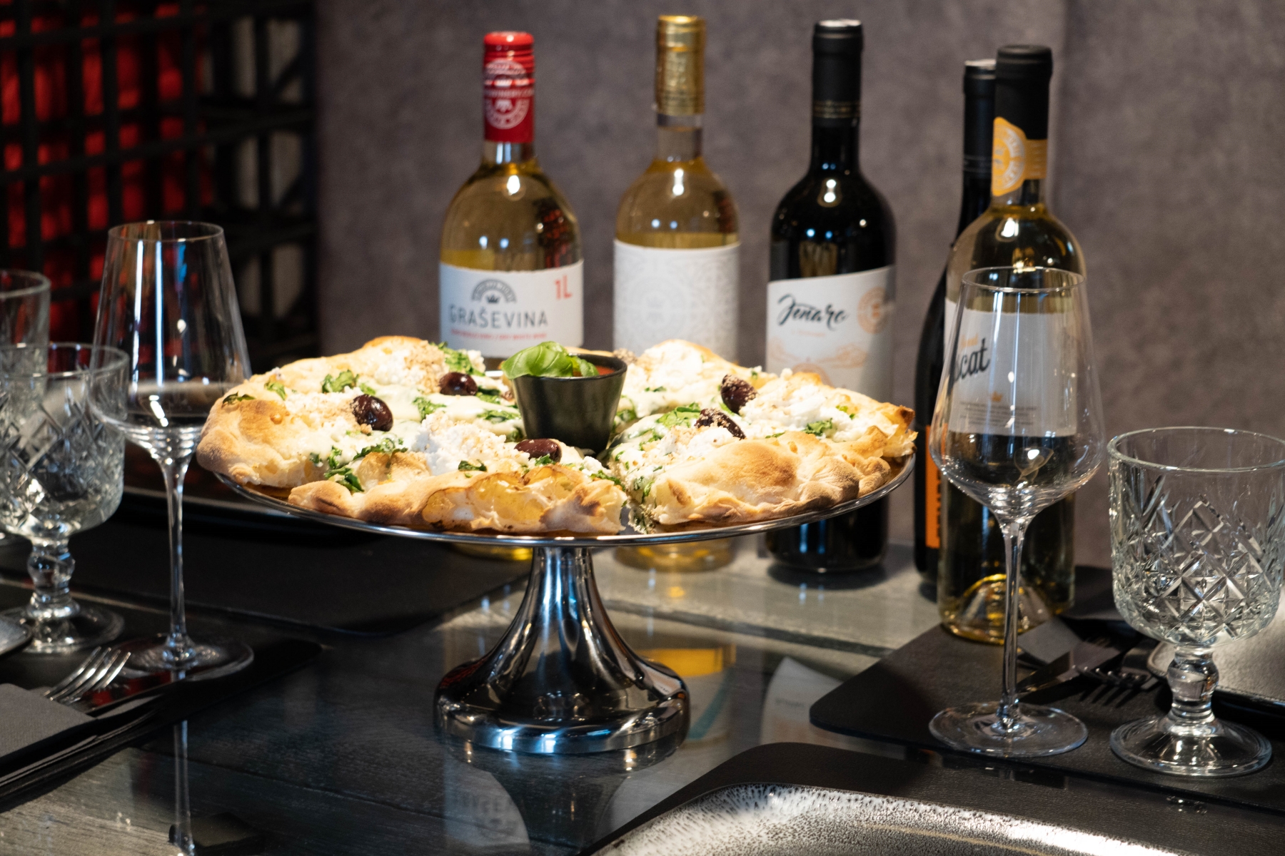 Uz pizzu Bresaolu koja sadrži goveđi pršut posluženo je vino Tempera, a uz Gurmansku pizzu smo završili uz Sweet Muscat.