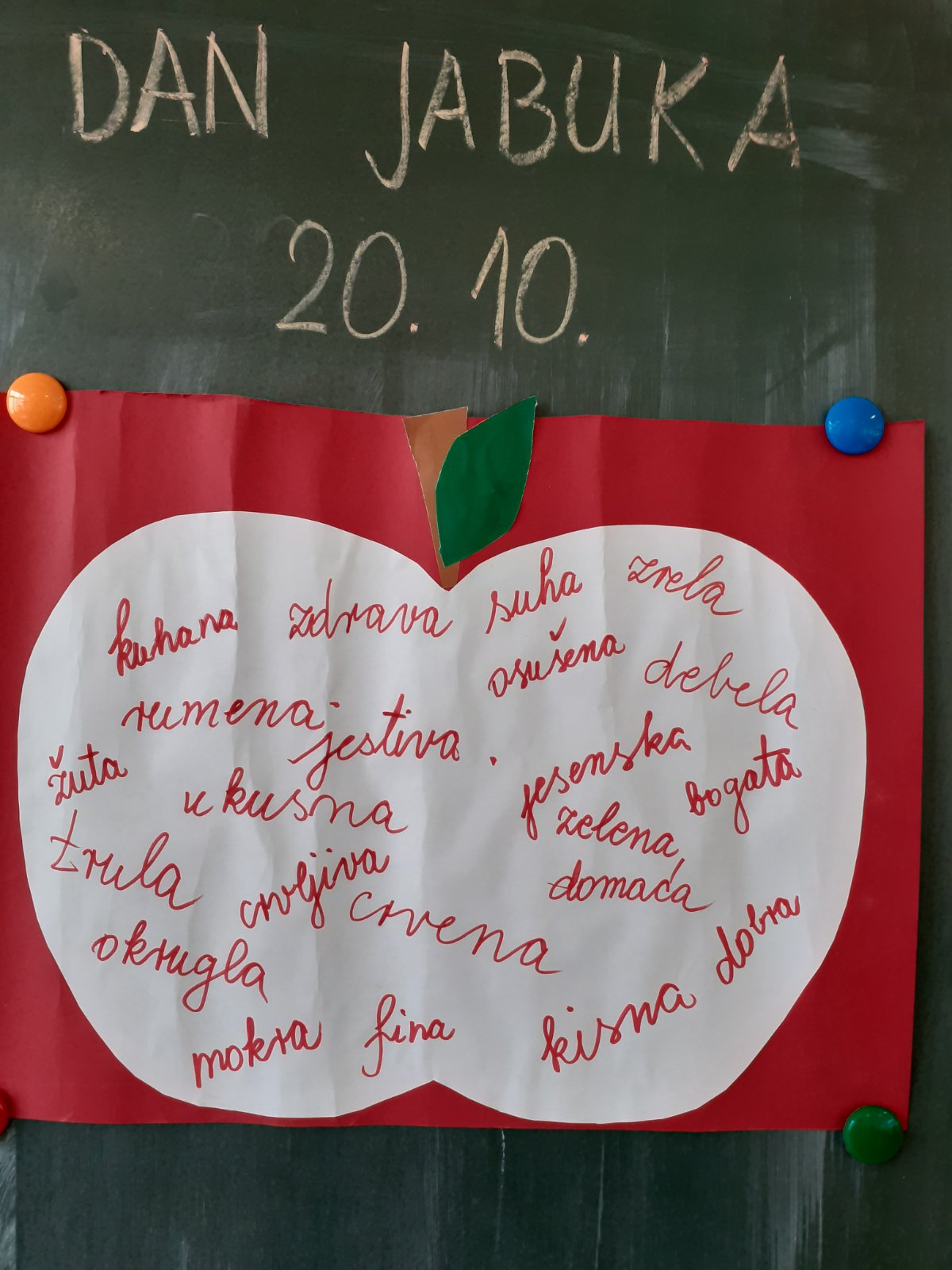 Pravi jesenski promjenjivi dan 20. listopada proveli su obilježavajući dan kraljice voća – Svjetski dan jabuka. “Učenici su pjesmom, pričom i glumom na zabavan način prikazali jabuku u svakodnevnom životu. Upotrijebili su osjetila vida, njuha, okusa i dodira kako bi istražili po čemu se jabuke razlikuju, a u čemu su slične, koje će upotrijebiti za sok, kompot ili pekmez, a koje su najukusnije kada ih jedemo svježe. Što znači da jabuka ne pada daleko od stabla, da je tuđa jabuka slađa ili da crv ne čini jabuku, raspravljali su i dijelili svoja mišljenja kako bi shvatili pravo i preneseno značenje poslovica.”