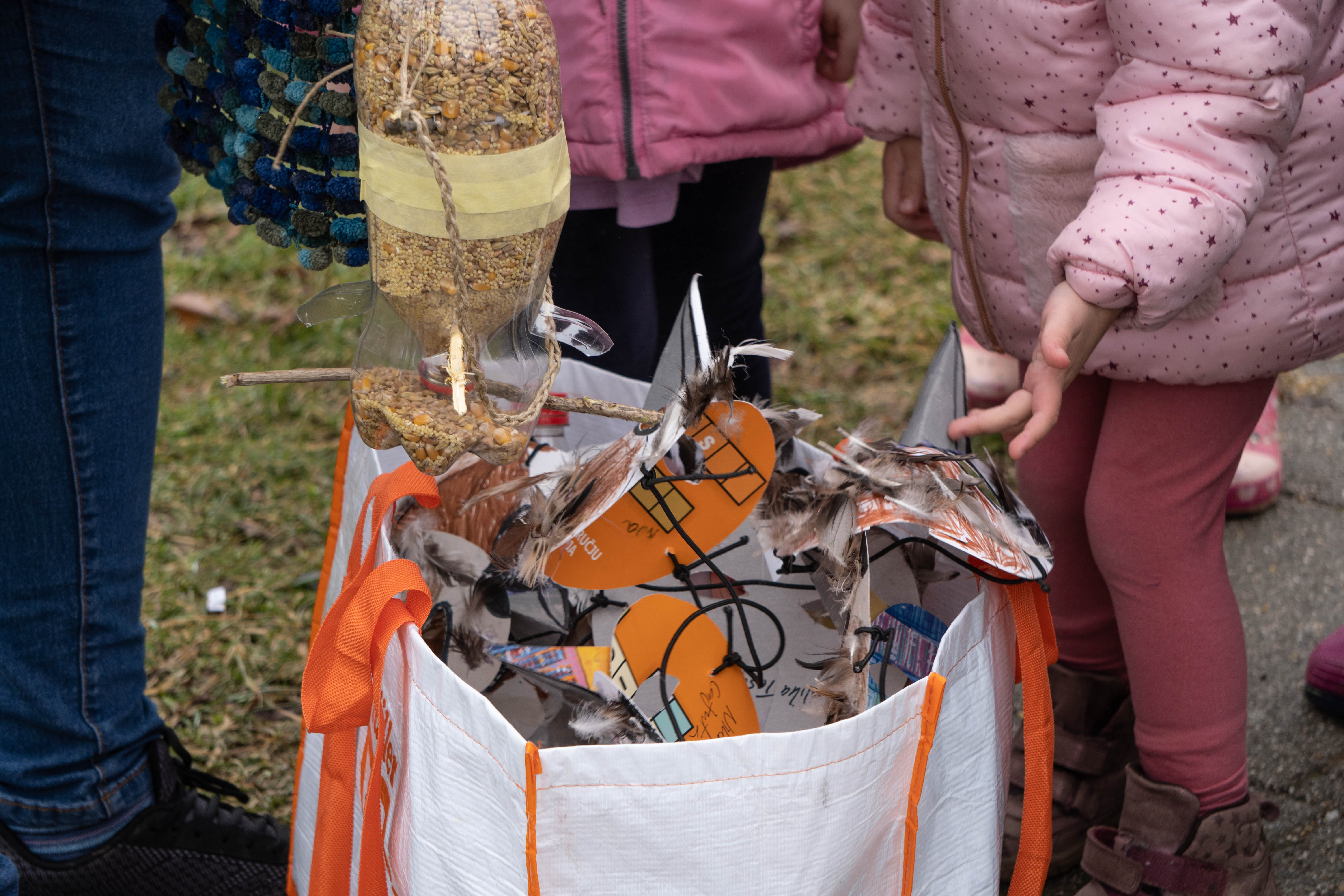 Hranilice za ptice izradili su reciklirajući materijale, ostvarivši suradnju s roditeljima, ali i širom zajednicom u nabavci raznog sjemenja i zrnja, te su ih postavili i u vrtićko dvorište.