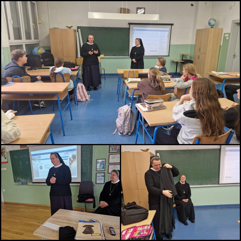 U sklopu Kurikuluma Katoličkog vjeronauka u osnovnoj školi dana 13. studenog 2025. su nas posjetile redovnice Kraljice svijeta iz Velike Gorice, sestra Ljubica Josić i sestra Marta Jozić. Predstavile su nam svoju redovničku zajednicu, što znači biti redovnica općenito i za njih osobno te nam opisale kako izgleda njihov uobičajan dan. Djeca su postavljala zanimljiva pitanja, a najzanimljivi trenutak je bio kada su djevojčicama ponudile da ih obuku u je njihovu uniformu. Susret smo završile u pozitivnom duhu dogovarajući ponovni susret u samostanu.