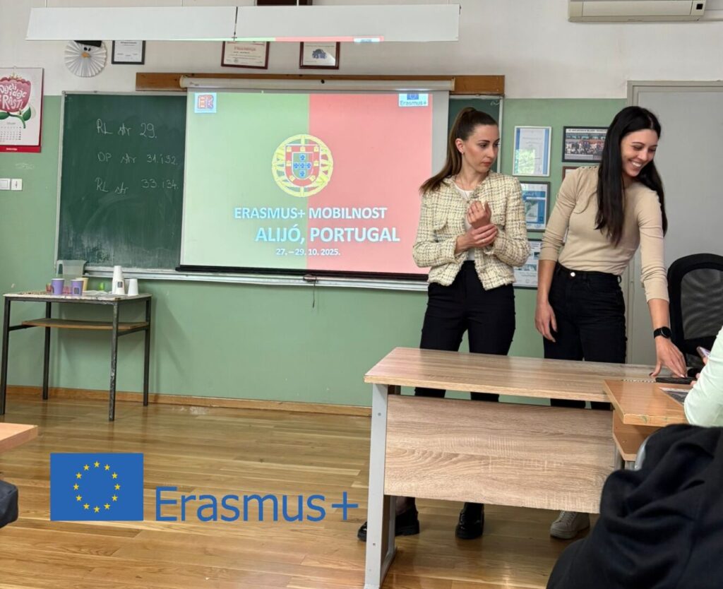 Svoja iskustva s mobilnosti u obliku praćenja rada u školi Agrupamento de Escolas D. Sancho II u Alijóu, Portugal, održane od 27. do 29. listopada 2025., predstavile su Anja Petrović i Marija Štuglin. U svome su izlaganju istaknule primjere školskih praksi povezanih s održivim razvojem, uključivanjem učenika u aktivno učenje te primjenom suvremenih i kreativnih metoda rada u nastavi.