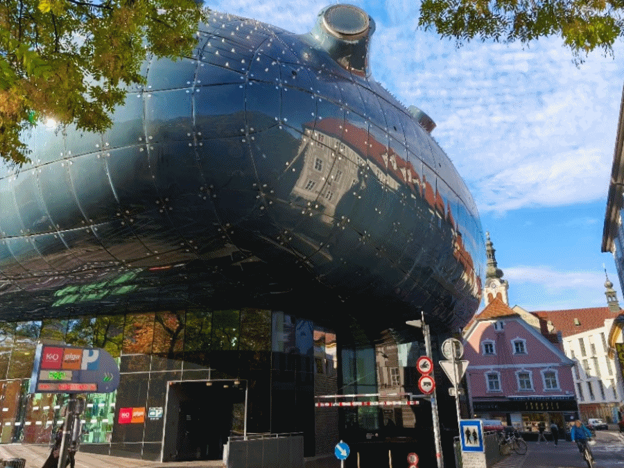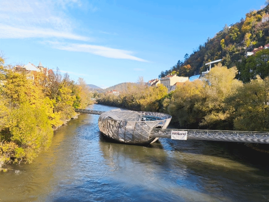 Onda smo se prošetali do rijeke Mure i prešli preko Murinsela na drugu stranu rijeke. Murinsel je kao mala školjka na sredini rijeke pomoću koje se može prijeći s jedne strane na drugu. U toj školjci je kafić i tu se održavaju razni događaji.