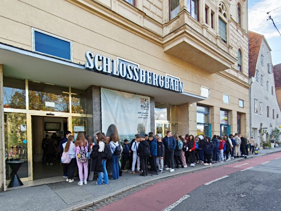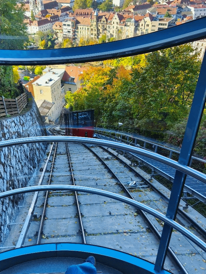 Kada smo prešli na drugu stranu, zaputili smo se do uspinjače. Uspinjača nas je odvela na vrh znamenitog Schlossberga na kojem se nalazi satna kula Uhrturm. Tvrđava Uhrturm je i simbol grada Graza.