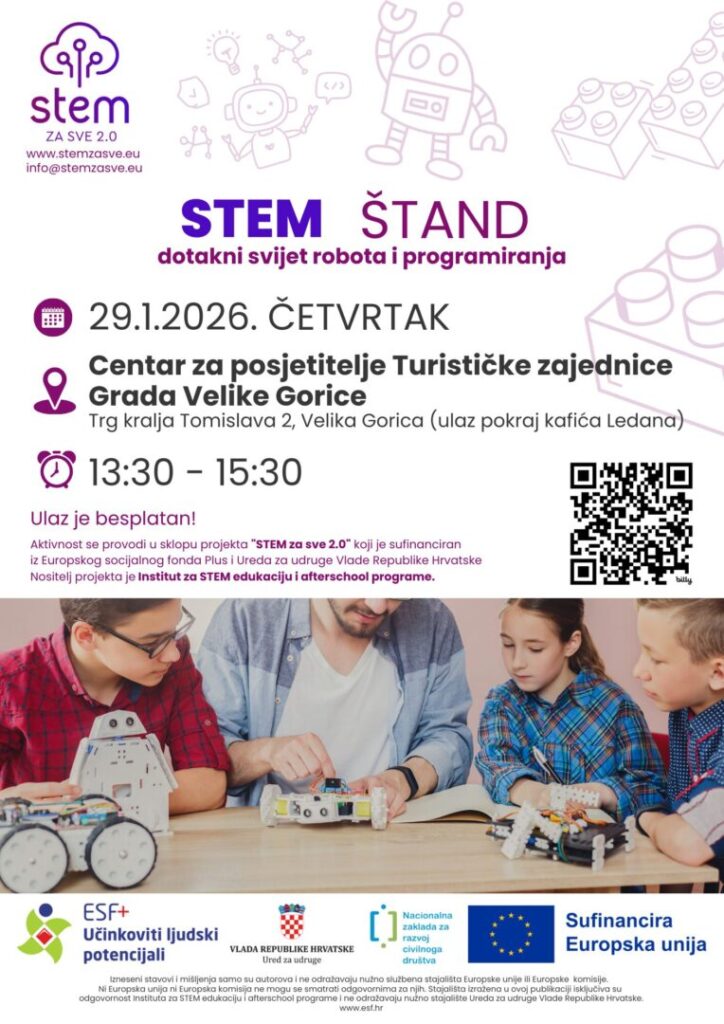 U sklopu projekta STEM za sve 2.0 Institut za STEM edukaciju i afterschool programe organizira besplatni STEM štand koji će se 29. siječnja održati u Centru za posjetitelje Turističke zajednice Grada Velike Gorice, Trg kralja Tomislava 2, ulaz pokraj Ledane.