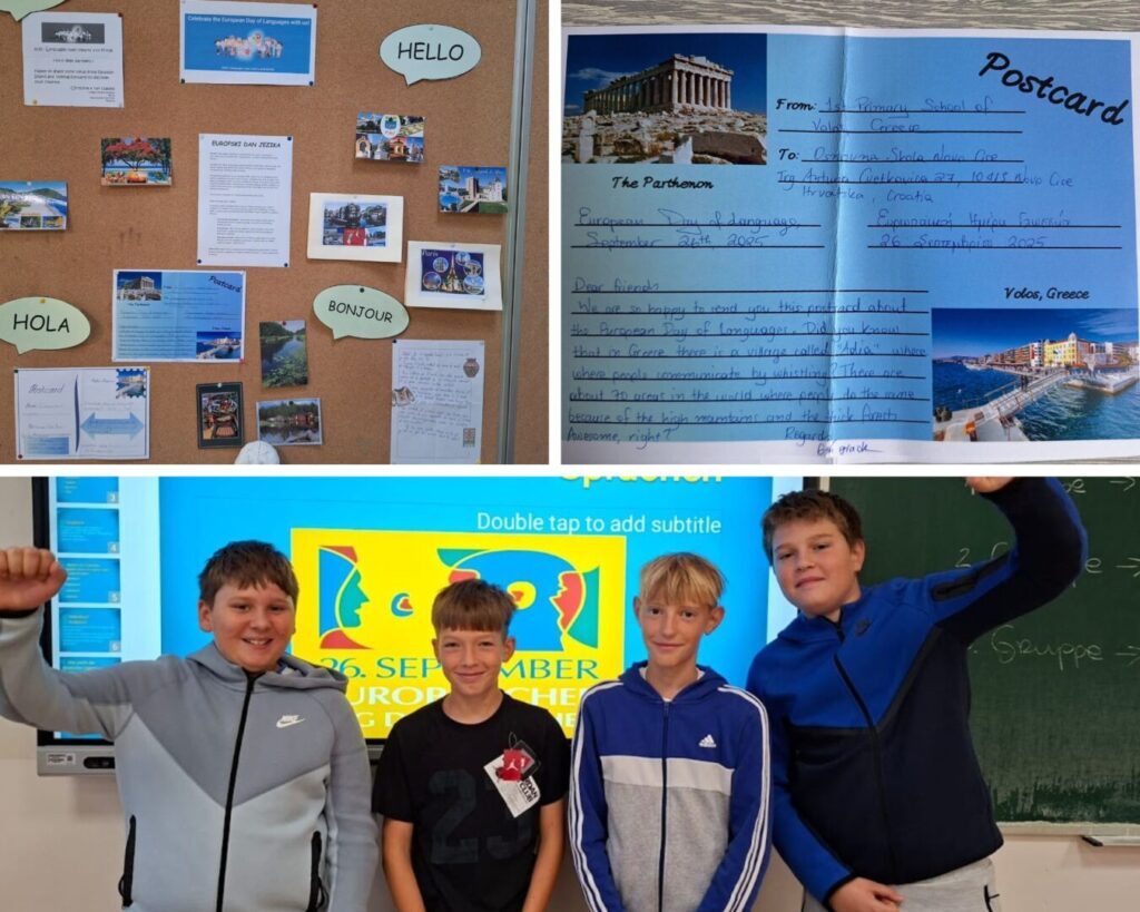 Europski dan jezika u našoj je školi obilježen rješavanjem prigodnih kvizova i mozgalica kojima smo provjerili koliko smo već naučili, što sve znamo i koliko još prostora imamo za učenje i napredak. Na satu engleskog jezika učenici su, u sklopu eTwinning projekta, pisali razglednice koje su zatim poslane u 13 europskih škola. U projektu su sudjelovale škole iz Francuske, Italije, Rumunjske, Grčke, Turske, Španjolske, Finske i Mađarske.