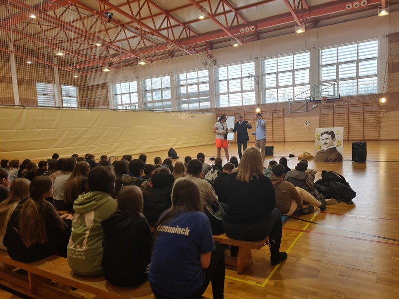 U četvrtak 29.1. u našoj je školi gostovala predstava Jedan Tesla kazališta Lutonjica Toporko, koja je učenicima viših razreda na zanimljiv i dinamičan način približila život i rad Nikole Tesle. Umjesto klasične biografske priče, predstava je oblikovana kao duhovita i interaktivna igra u kojoj trojica glumaca kroz glumu, improvizaciju i pokuse istražuju Teslin genij.