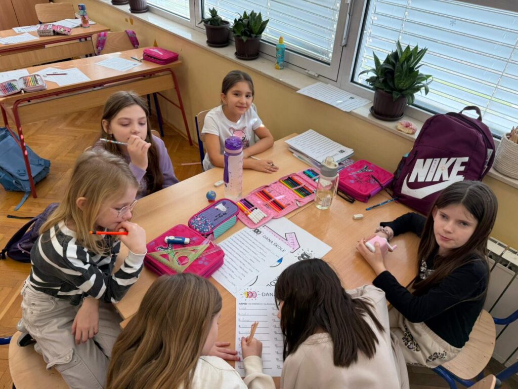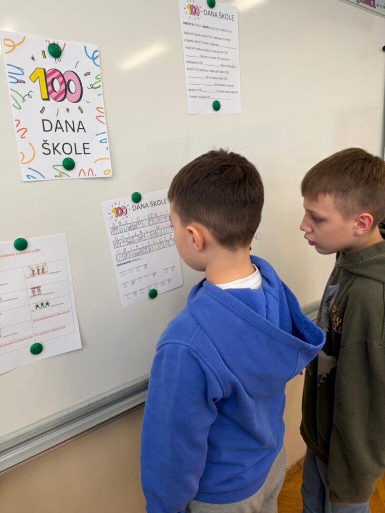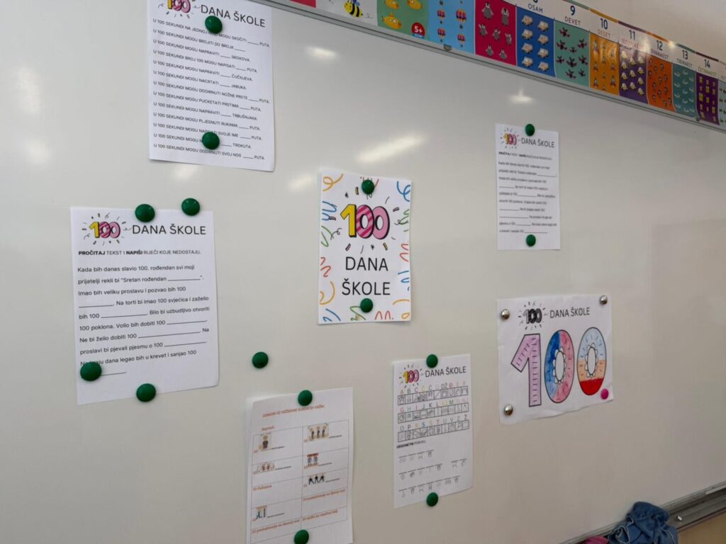 Učenici 3. razreda su sa svojom učiteljicom, Martom Ceković, proslavili 100. dan škole nizom kreativnih, edukativnih i zabavnih aktivnosti. Dan je započeo ukrašavanjem zajedničkog natpisa za 100. dan škole, zatim se nastavio aktivnostima što se sve može učiniti u 100 sekundi. Učenici su zatim zamišljali sebe sa 100 godina. Nakon toga je uslijedio rad u skupinama i na taj način su učenici ponovili imenice, glagole i pisanje velikog početnog slova. Traženjem naziva naseljenih mjesta, voda i uzvisina ponovili su i snalaženje na geografskoj karti RH. Također su uspjeli riješiti i 100 matematičkih zadataka. Posebno veselo je bilo tijekom izvođenja 10 vježbi koje su ponovili 10 puta. Ponosni smo na zajedništvo, trud i osmijehe kojima smo obilježili ovaj poseban, stoti dan naše nastavne godine.