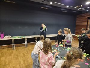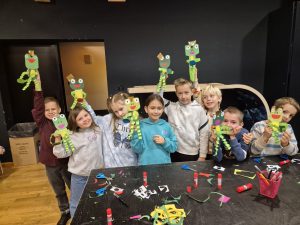 Prije početka predstave učenici su se okupili na likovnoj radionici gdje su izrađivali lutke žaba koristeći različite materijale – papir, karton, kolaž, ljepilo i škare. Voditeljica radionice poticala je djecu da izraze svoju maštovitost, pa su tako nastale vesele, šarene, velike i male žabe koje su kasnije poslužile kao divan ukras školskog prostora.