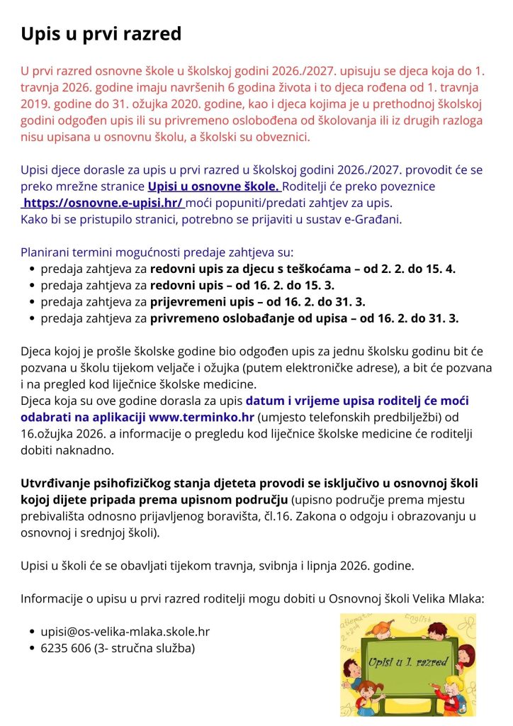 The post Upisi u prvi razred u školskoj godini 2026./2027. appeared first on OŠ Velika Mlaka.