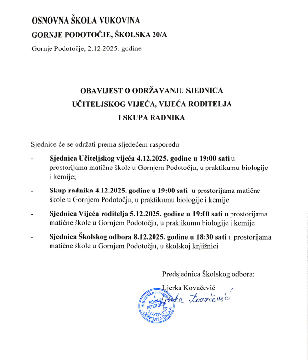 Obavijest o održavaju sjednica Učiteljskog vijeća, Vijeća roditelja i Skupa radnika Osnovne škole Vukovina