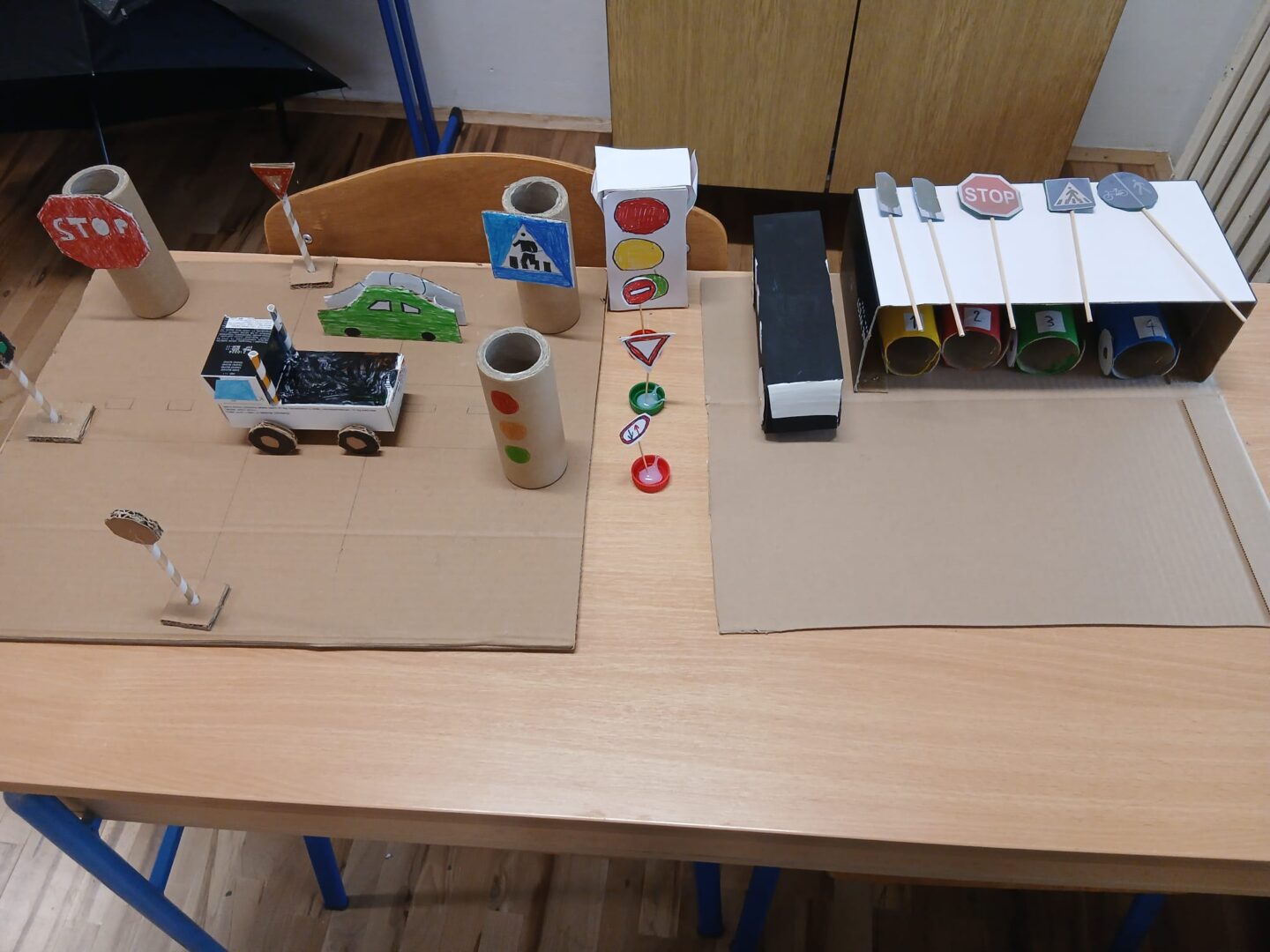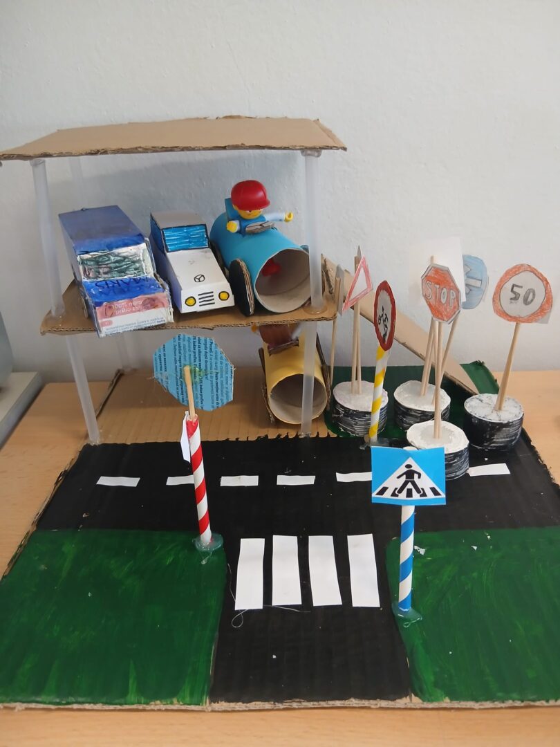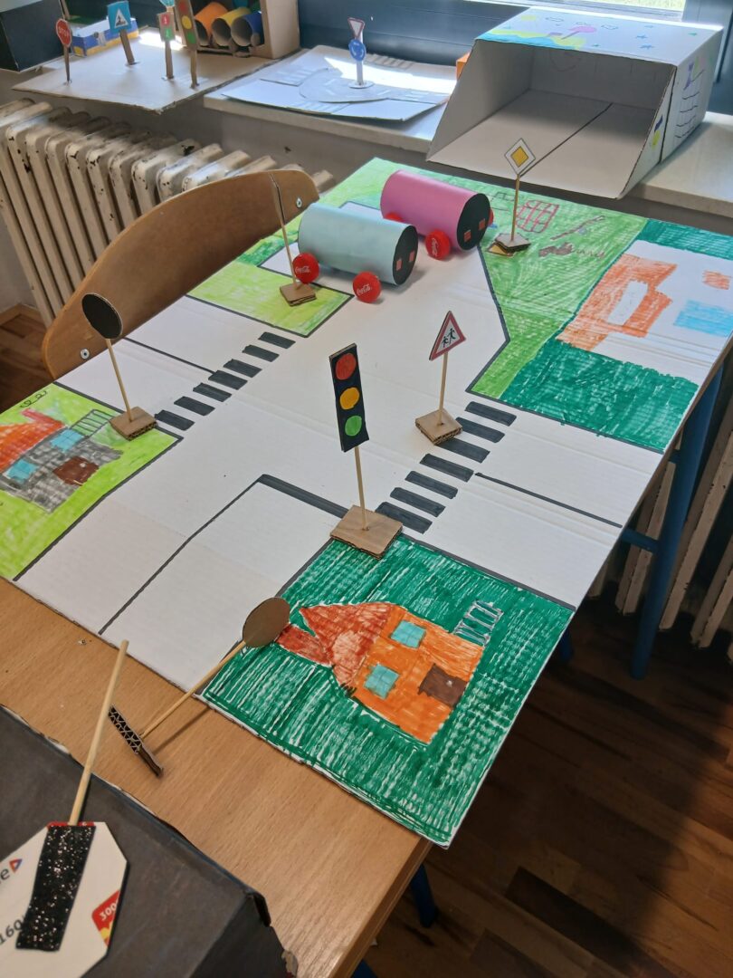 Imali smo još i praktičan rad iz prometa: izrada prometnih znakova,vozila i garaže od kartona, kutija te roli papira (reciklirani materijal).