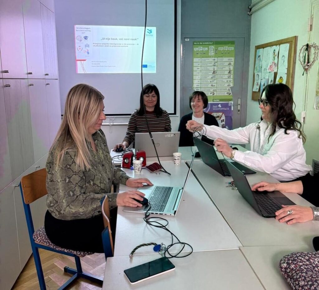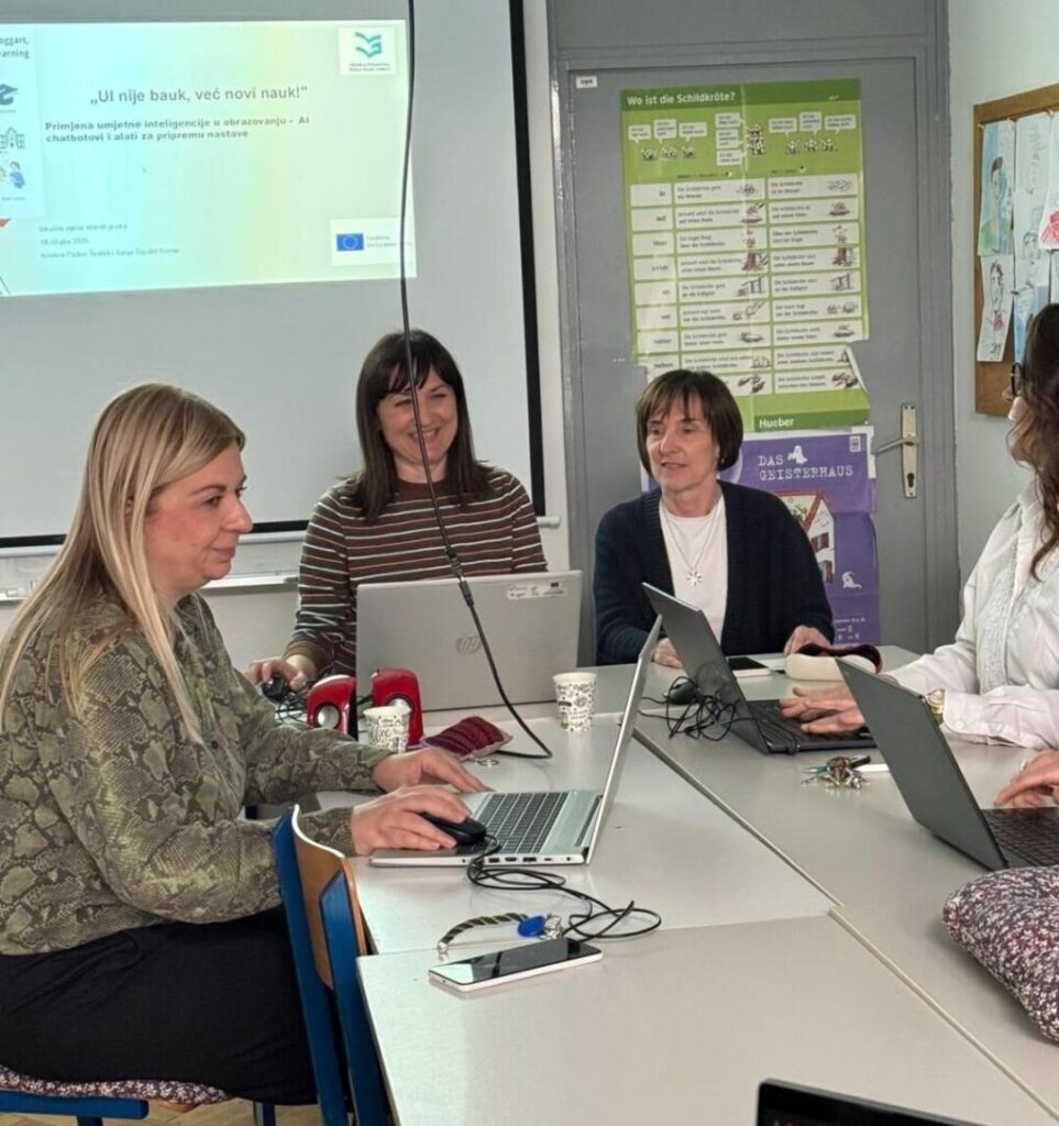 Edukacija o primjeni umjetne inteligencije i chatbotova bila je usmjerena na upoznavanje s modernim digitalnim alatima koji mogu unaprijediti nastavni proces, povećati motivaciju učenika i olakšati pripremu nastavnih materijala. Tijekom edukacije predstavljeni su alati ElevenLabs, Gamma, Suno i Notebook, uz praktične primjere njihove primjene u učionici.