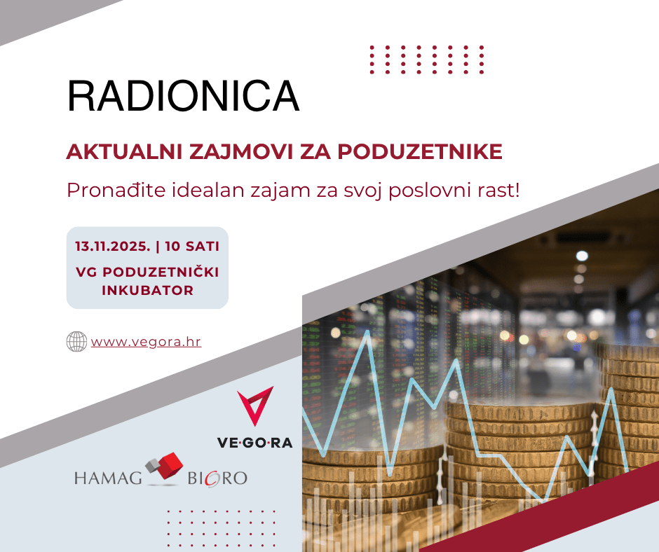 Pridružite nam se 13. studenoga 2025. s početkom u 10 sati u VG Poduzetničkom inkubatoru na informativnoj radionici gdje ćemo detaljno predstaviti najaktualnije zajmove i financijske instrumente koji su vam na raspolaganju.