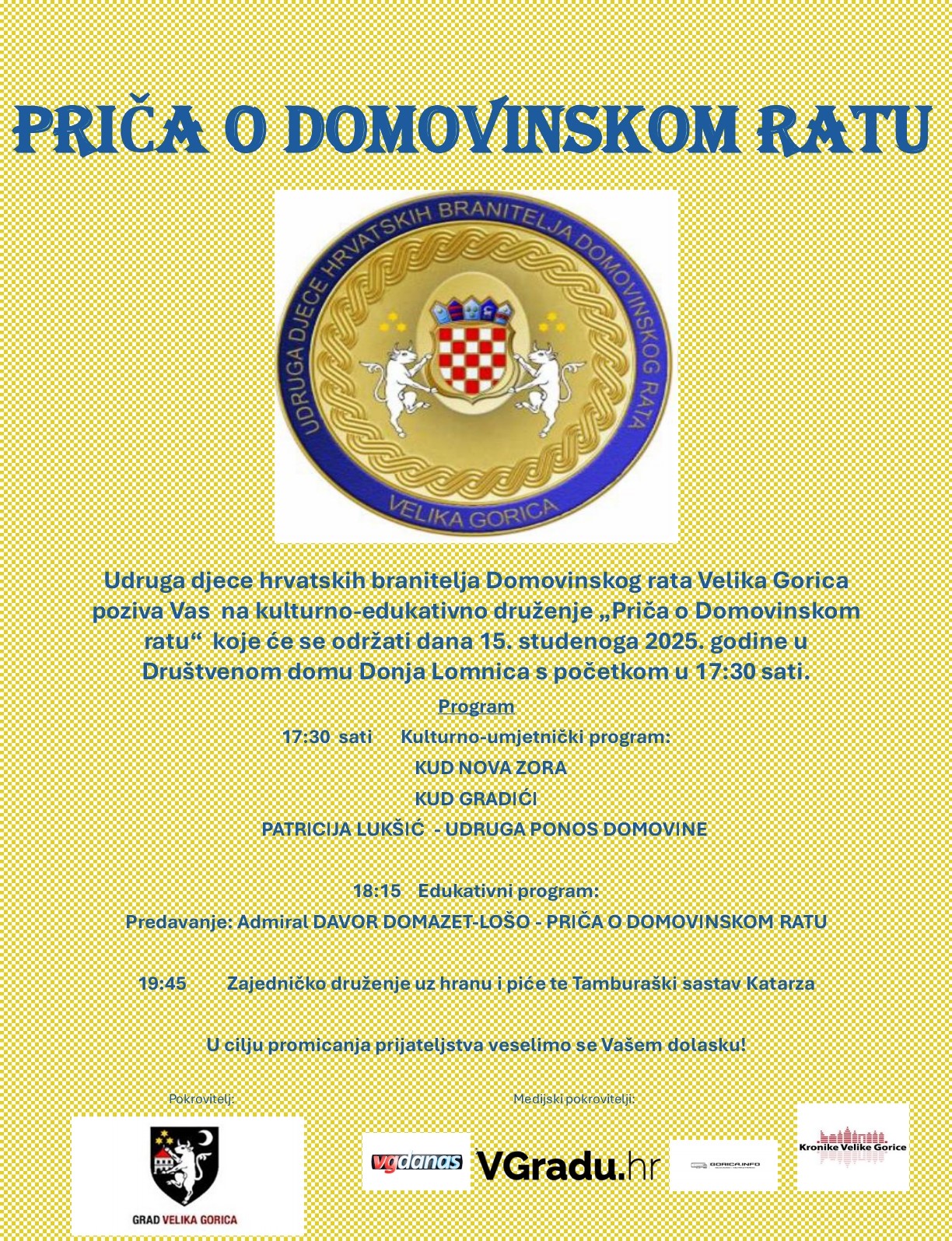Udruga djece hrvatskih branitelja Domovinskog rata Velika Gorica najavila je kulturno-edukativni program pod nazivom „Priča o Domovinskom ratu“, koji će se održati 15. studenoga 2025. godine u Društvenom domu Donja Lomnica s početkom u 17:30 sati. Događaj je namijenjen djeci hrvatskih branitelja, braniteljskim udrugama velikogoričkog područja te svim zainteresiranim građanima.