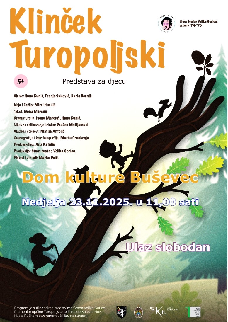 Nedjelja, 23. studenoga, rezervirana je za najmlađu publiku. Od 11 sati prikazuje se lutkarska predstava „Klinček Turopoljski“ ŠTOOS Teatra, nastala prema motivima tradicijskih priča Turopolja. Troje glumaca oživljava svijet djetinjstva, mašte i šume kroz spoj lutkarske igre i žive glume. Predstava prati Juricu u potrazi za izgubljenim žirom, simbolom djetinjstva i povezanosti s prirodom, te kroz susrete s bajkovitim šumskim likovima progovara o rastu, prijateljstvu, različitostima i zajedništvu. Predstava je namijenjena djeci, ali i odraslima koji žele uroniti u toplinu tradicije.