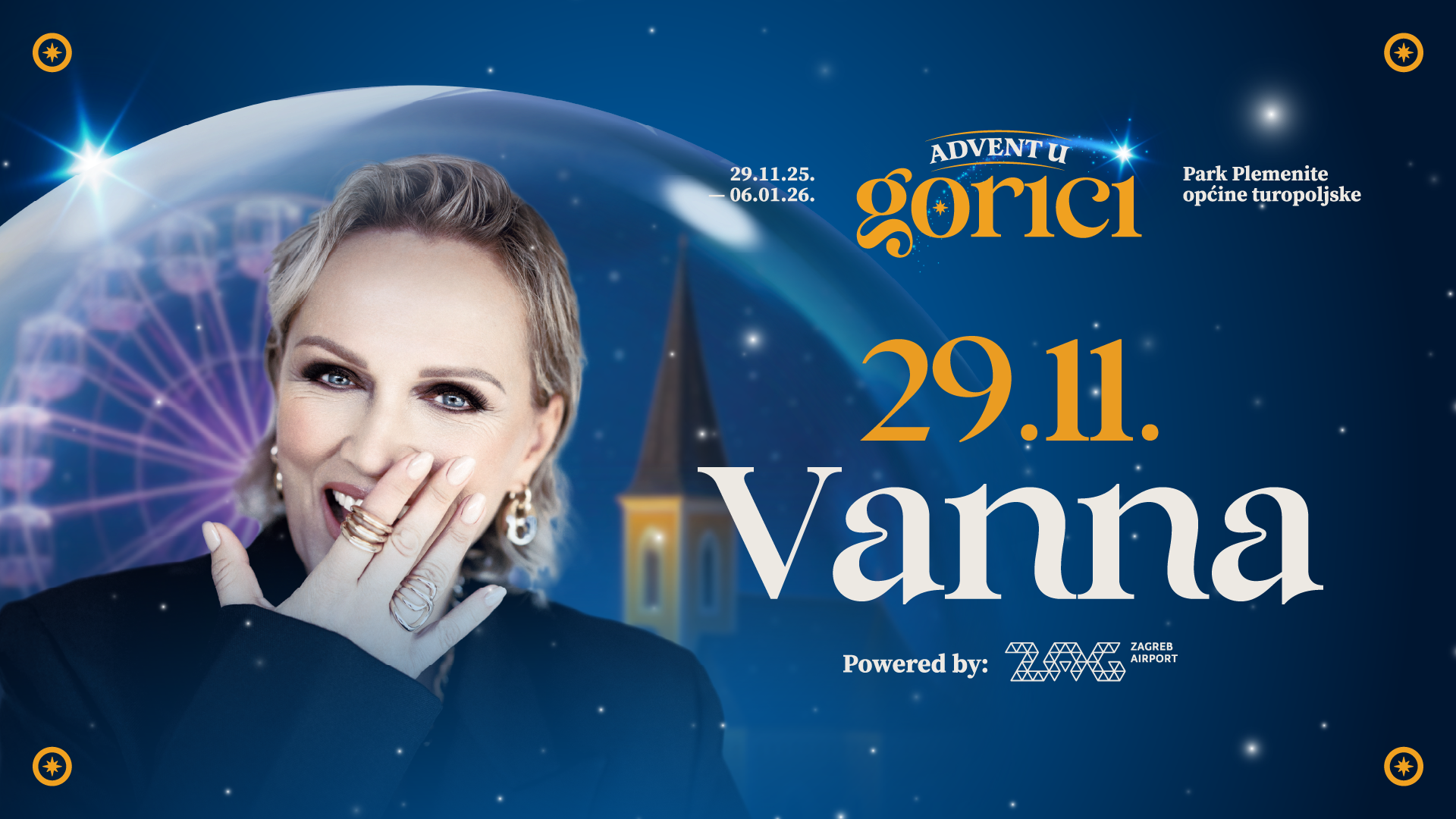 U 18 sati na Trgu Stjepana Radića bit će upaljena prva adventska svijeća uz zbor župe sv. Petra i Pavla i mlade FA Turopolje. U parku će posjetitelje dočekati „ho-ho party“ s DJ Vedranom Carom, kao glazbeni uvod u večernji koncert Vanne u 20:30 sati.