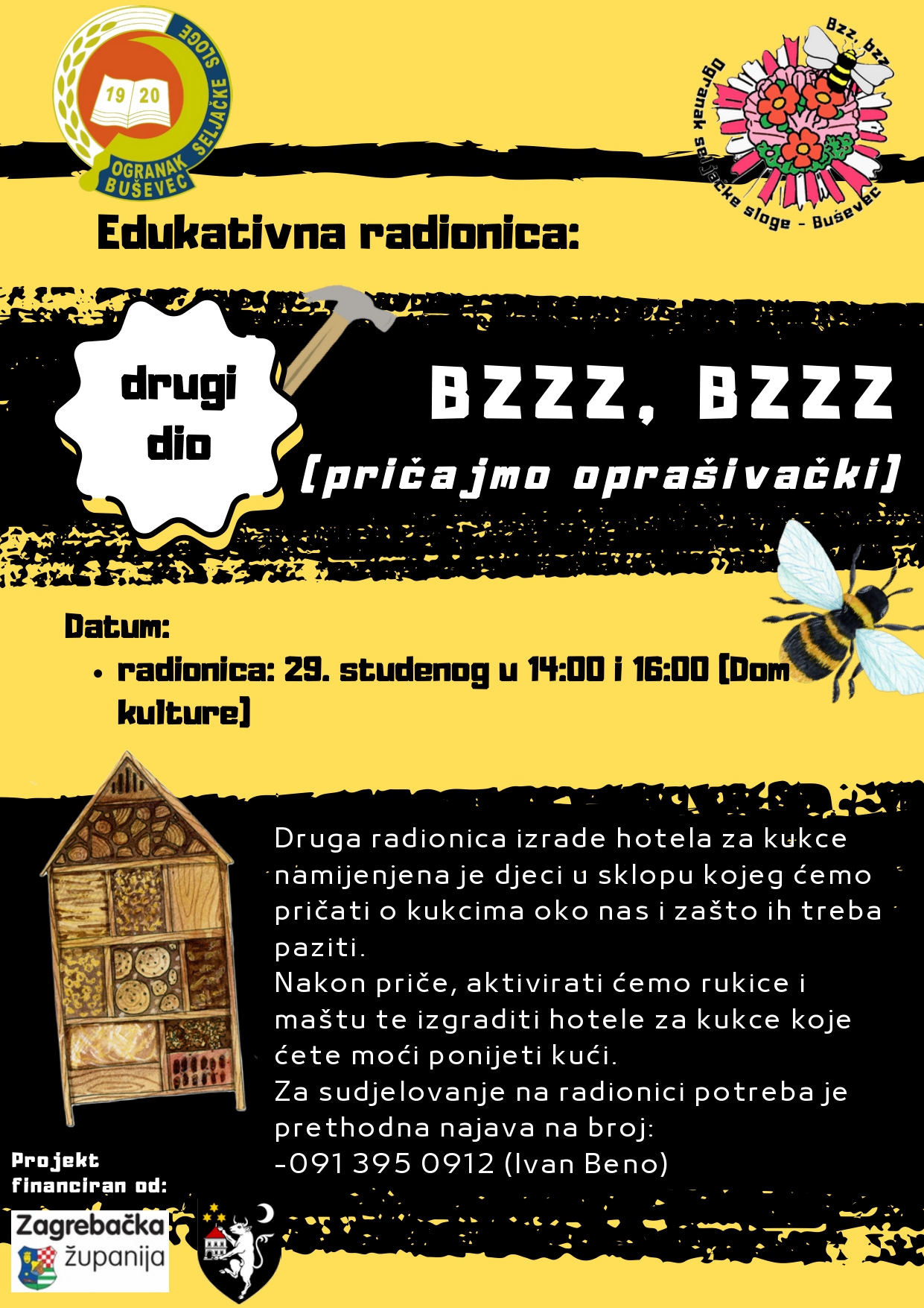 U sklopu projekta „Bzzz, bzzz” zakazana je druga radionica koja će se održati 29. studenoga 2025. godine te će najmlađima ponuditi priliku da na zabavan i edukativan način otkriju svijet kukaca. Radionice će biti održane u dva termina, u 14 i 16 sati, a organizatori pozivaju djecu da se pridruže i saznaju sve što ih je oduvijek zanimalo o ovim malim, ali iznimno važnim stanovnicima našeg ekosustava.