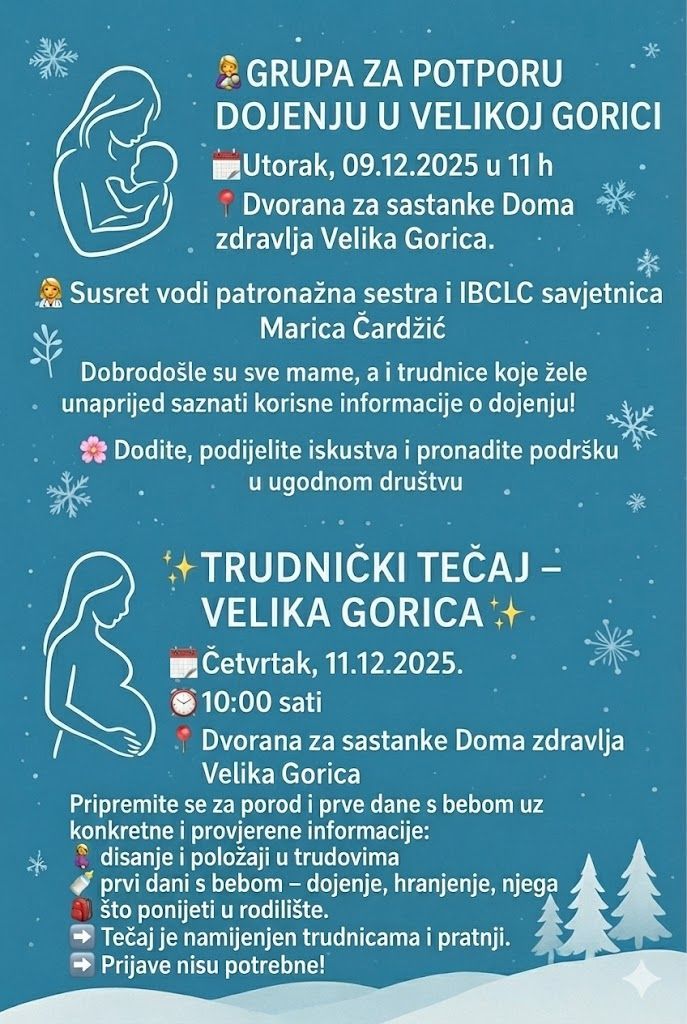 Dom zdravlja Velika Gorica i ovog prosinca organizira korisna i topla predblagdanska druženja za sve buduće roditelje i one koji su to tek postali. Riječ je o dva događanja koja pružaju stručnu podršku, razmjenu iskustava i ugodnu zajedničku atmosferu.