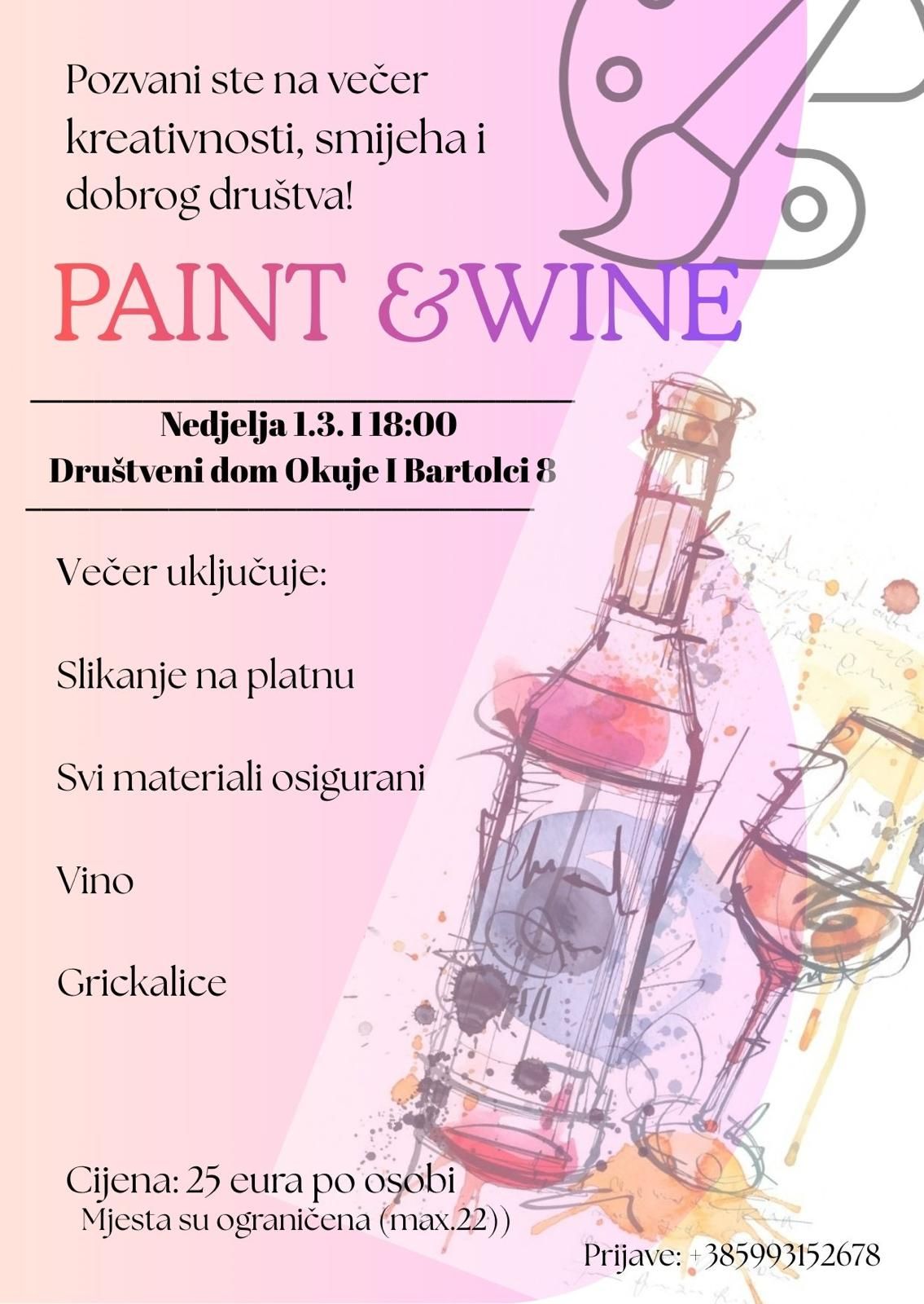 Prvi događaj, „Paint & Wine“, održat će se u nedjelju, 1. ožujka u 18 sati. Riječ je o opuštenoj radionici slikanja na platnu uz vino i grickalice, namijenjenoj svima – bez obzira na prethodno slikarsko iskustvo. Svi materijali za slikanje su osigurani, a cilj večeri je potaknuti kreativnost, smijeh i zajedništvo. Cijena sudjelovanja iznosi 25 eura po osobi, a broj mjesta je ograničen na maksimalno 22 sudionika, stoga je potrebna pravovremena prijava na broj 098 931 5267.