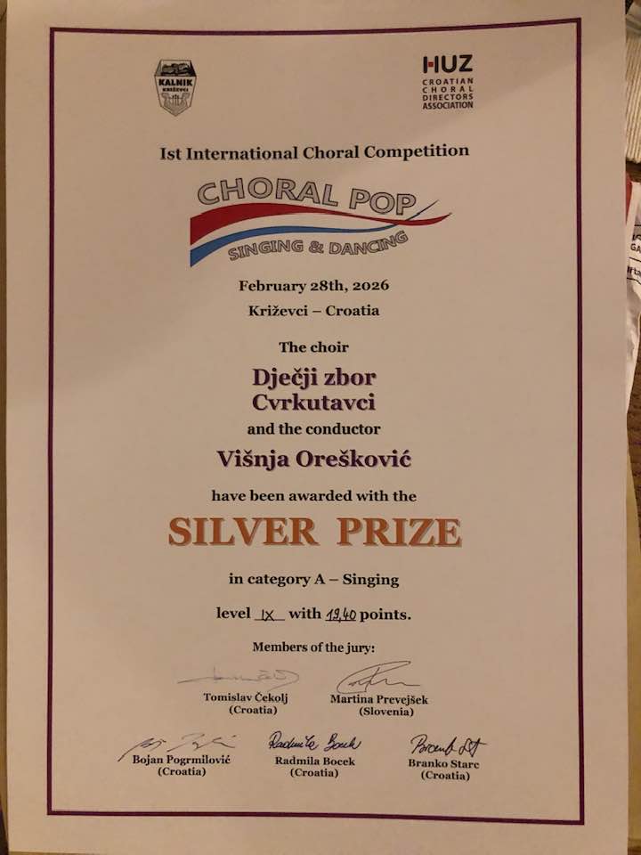 Cvrkutavci osvojili srebrnu nagradu na 1. međunarodnom natjecanju CHORAL POP u Križevcima