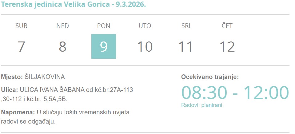 Zbog planiranih radova na elektroenergetskoj mreži u ponedjeljak, 9. ožujka 2026. godine, doći će do privremenog prekida opskrbe električnom energijom na području Šiljakovine.