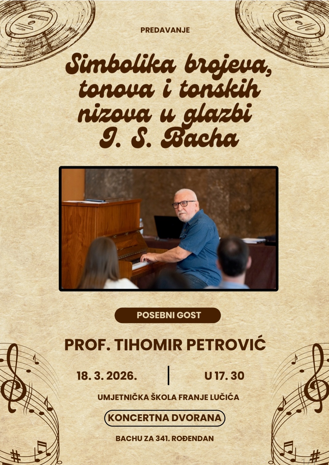 Predavanje pod nazivom „Simbolika brojeva, tonova i tonskih nizova u glazbi Johanna Sebastiana Bacha“ održat će profesor Tihomir Petrović, jedan od vodećih stručnjaka u području teorije glazbe i dugogodišnji gost škole.