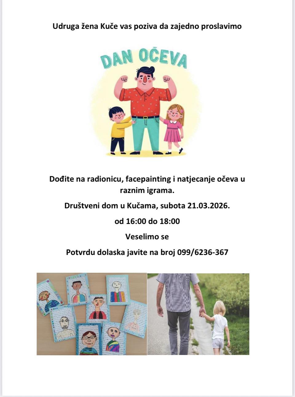 Udruga žena Kuče poziva sve mještane i njihove obitelji da se pridruže proslavi Dana očeva, koja će se održati u subotu, 21. ožujka 2026. godine u Društvenom domu u Kučama. Program traje od 16:00 do 18:00 sati, a posjetitelje očekuje raznovrstan i zabavan sadržaj za sve uzraste.
