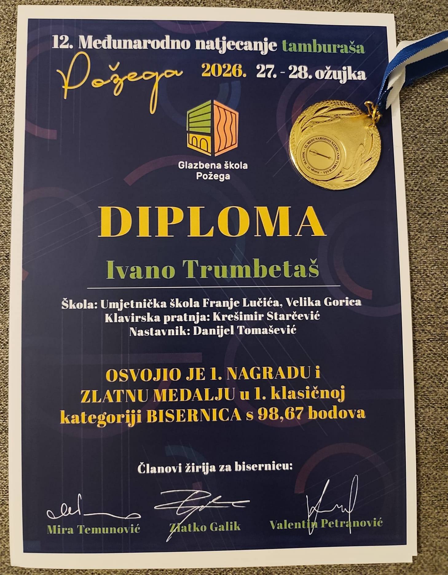 Učenici tambure Umjetničke škole Franje Lučića iz Velike Gorice ostvarili su zapažene rezultate na 12. Međunarodnom natjecanju tamburaša, održanom u Glazbenoj školi u Požegi.