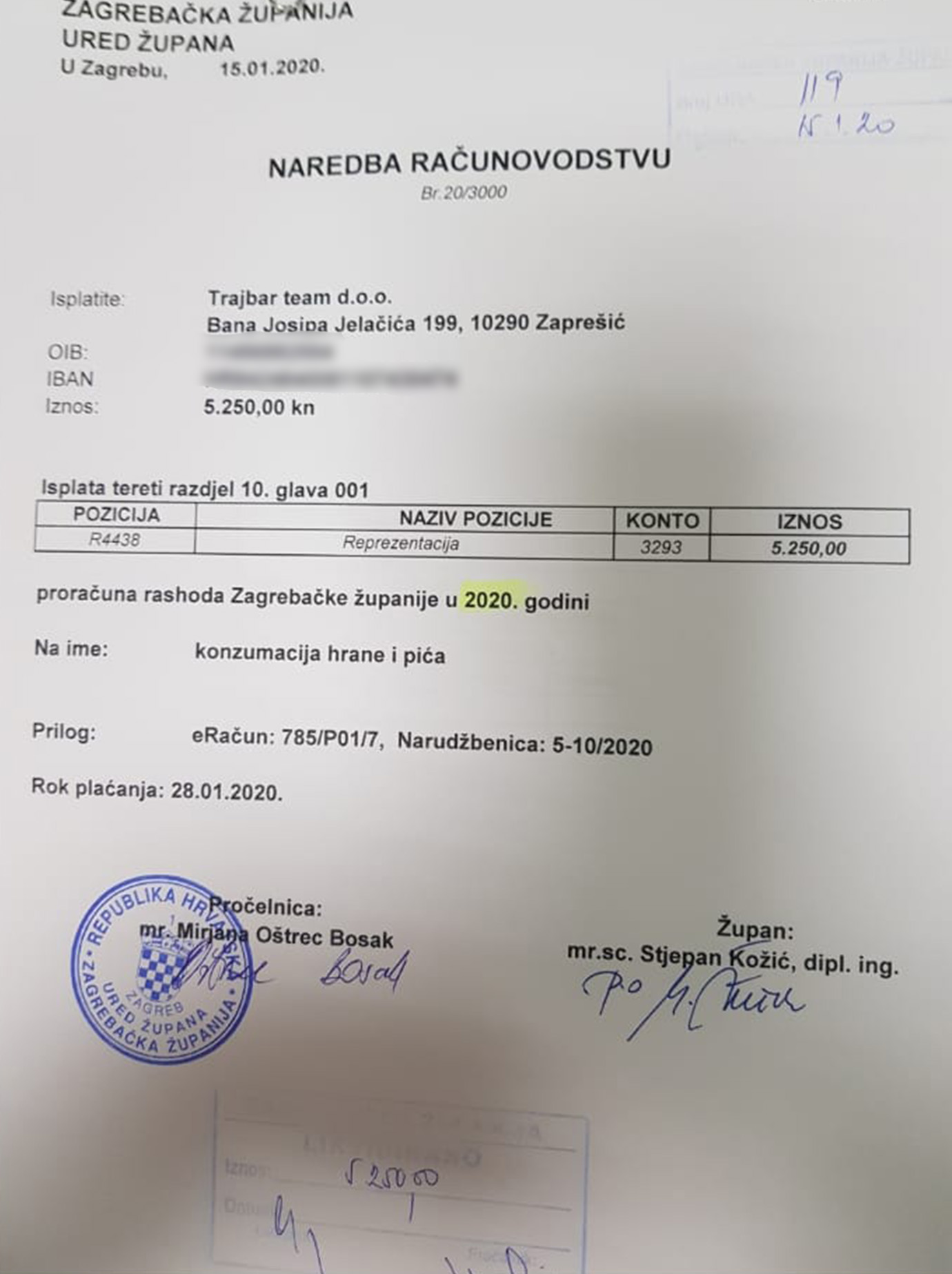 RTL je u posjedu spornog računa. Iz njega je vidljivo kako je 20 osoba u jednom restoranu kod Zaprešića 13. siječnja 2020. godine u poslijepodnevnim satima blagovalo za ukupno 5250 kuna, a račun je platila Zagrebačka županija.