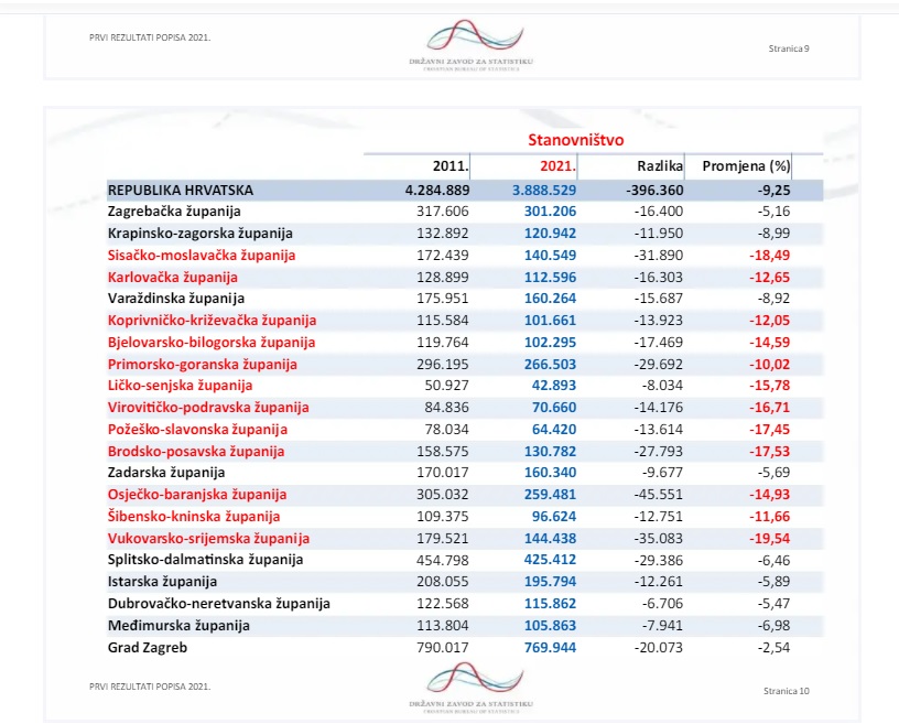 Vukovarsko-srijemska županija u 10 godina izgubila je 35.083 stanovnika (19,54 posto u odnosu na popis 2011.), Sisačko-moslavačka županija 31.890 stanovnika (18,49 posto), a Brodsko-posavska županija 27.793 stanovnika (17,53 posto), pokazuju prvi rezultati Popisa stanovništva, kućanstava i stanova 2021. kojeg je tijekom prošle godine proveo Državni zavod za statistiku (DZS).