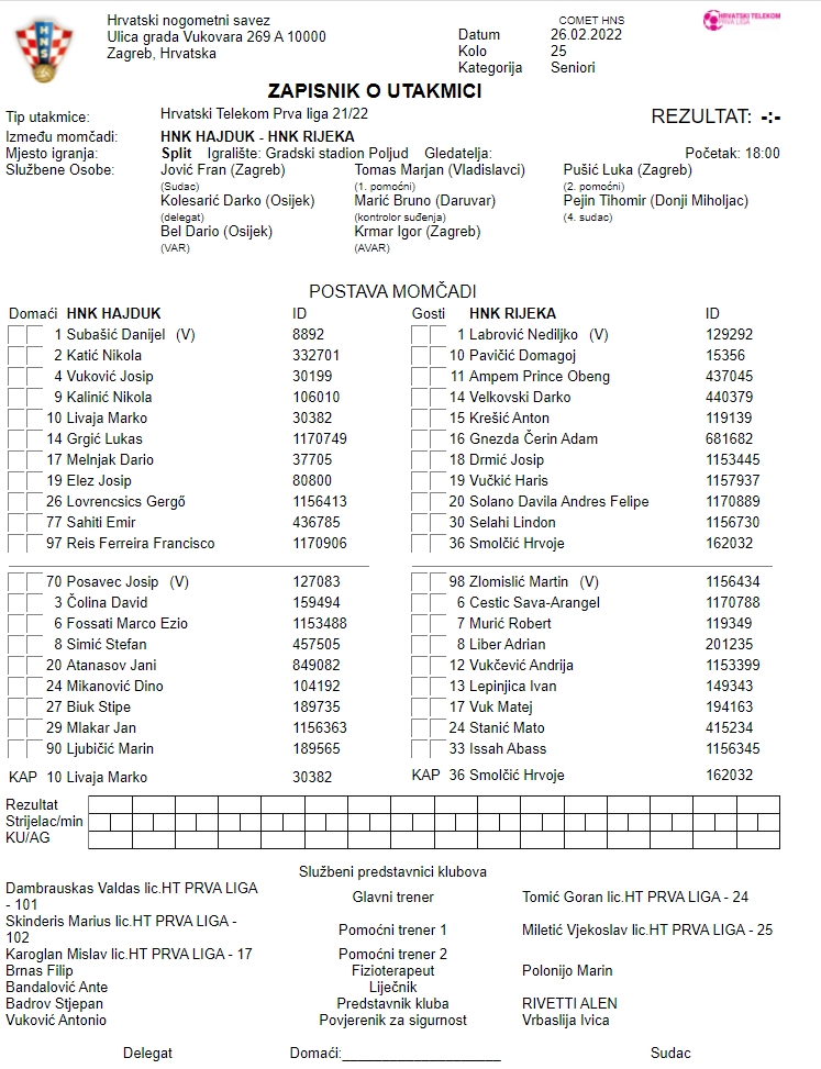 74'- Izašao je Ampem, a ušao Vukčević, te je izašao Selahi, a ušao Liber kod Rijeke dok je kod Hajduka izašao Melnjak, a ušao Čolina