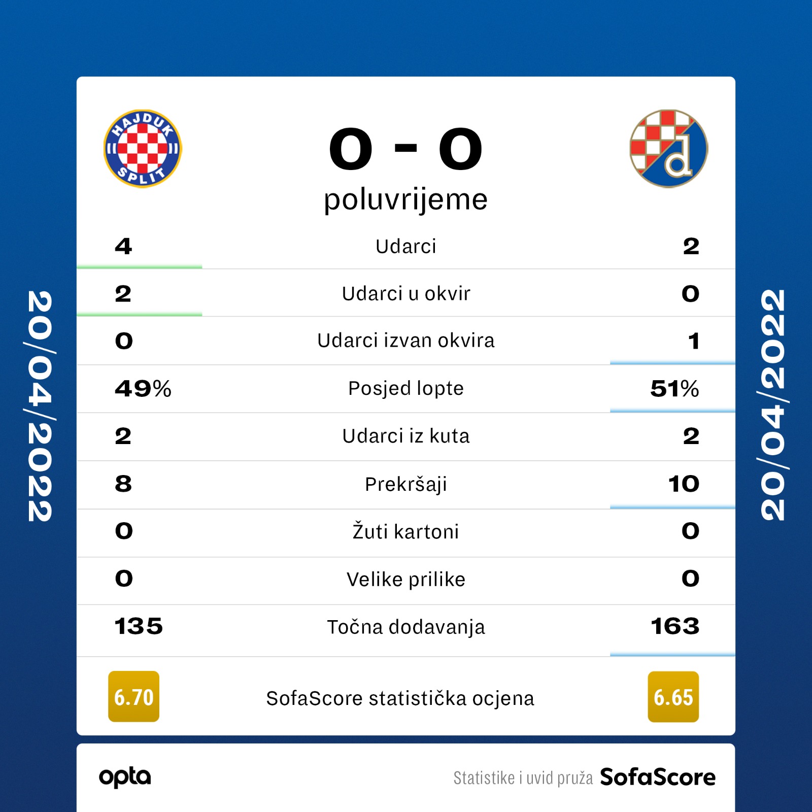 22' Dinamo je sada pritisnuo Spličane. Najprije je Emreli sjajnim solo prodorom pucao pored vrata, a zatim je nakon jedne gužve u šesnaestercu lopta došla do Ristovskog čiji je udarac blokiran