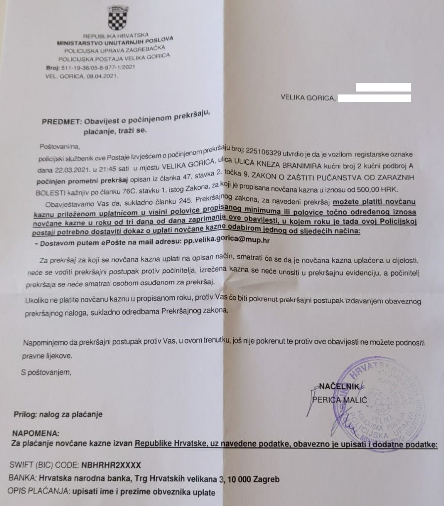 Čitatelj RTL.hr-a (podaci poznati redakciji) ostao je nemalo iznenađen kada je nedavno na njegovu adresu stigla kazna koju su mu poslali iz policije.